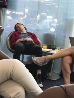 I was a little excited to finally be getting away for our week in Melbourne, so didn’t sleep as long as Debbie would have liked. We finished our packing and headed to the airport. Interestingly, the taxi company was offering a fixed fare of $38. So I wonder if they’ve worked out that competing with UBER is simply a case of competing, rather than complaining. It wasn’t all that early, but sitting in the lounge seemed to tire some people out completely!