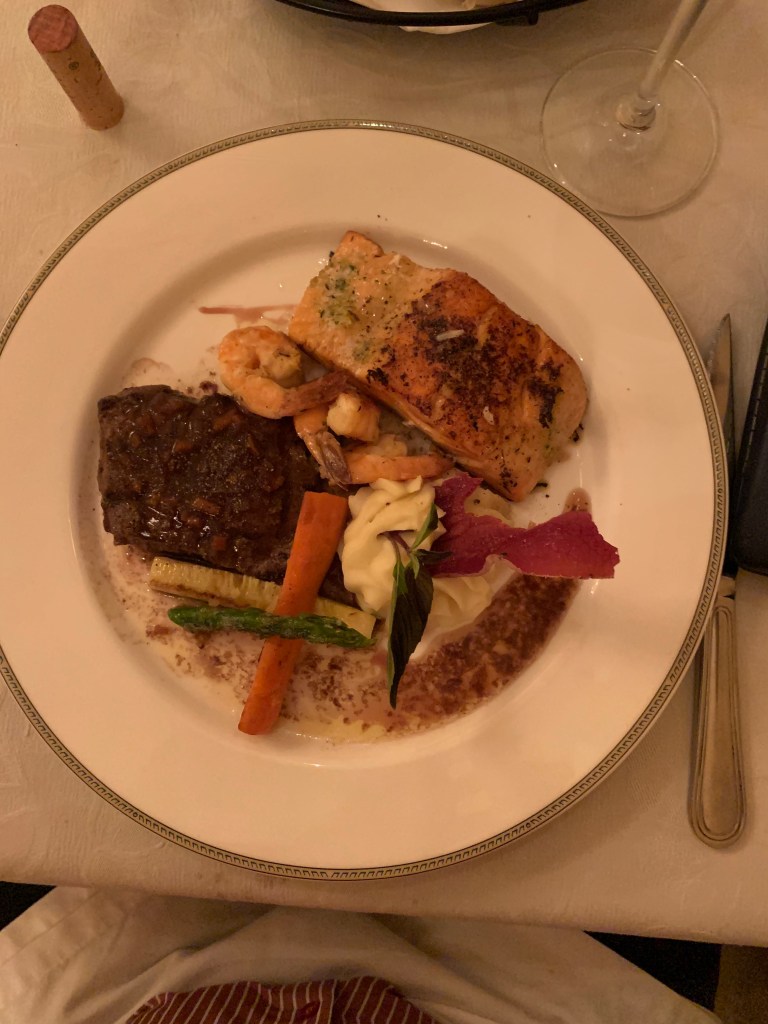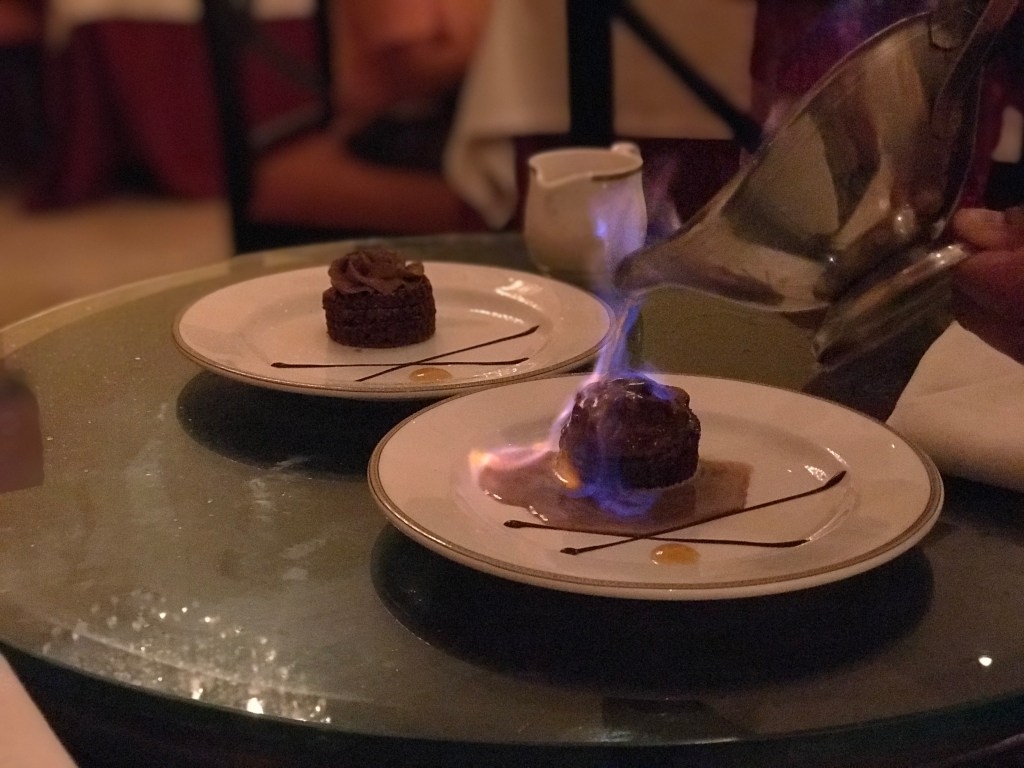 One of the discoveries of this trip has been that there are some wines made in Mexico which are pretty decent. There seems to be a thing here of having multiple meat items as your meal. I had salmon, steak and shrimps, while Debbie went for the lobster, steak and shrimps. The meal was excellent and we finished with a ‘burning dessert’ that was spectacular.