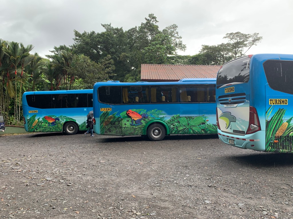 With a scheduled 6:15 pickup this morning that actually turned out to be a 7:00 one, we had an early night. Traffic in San Jose seems to be a challenge most of the time and our tour bus was no exception . After we were picked up there was one more hotel stop and then the bus was pretty full. San Jose sits at about 1100 metres above sea level and we had to cross the central divide (1700m) for our journey to the east coast. We were headed to the Tortuguero National Park for a couple of days, staying at the Pachira Lodge. After about 2 hours on the road we had a breakfast stop at a property that seemed exclusively for the tour buses. There was a nice garden of rainforest plants next to the carpark to whet the appetite.
