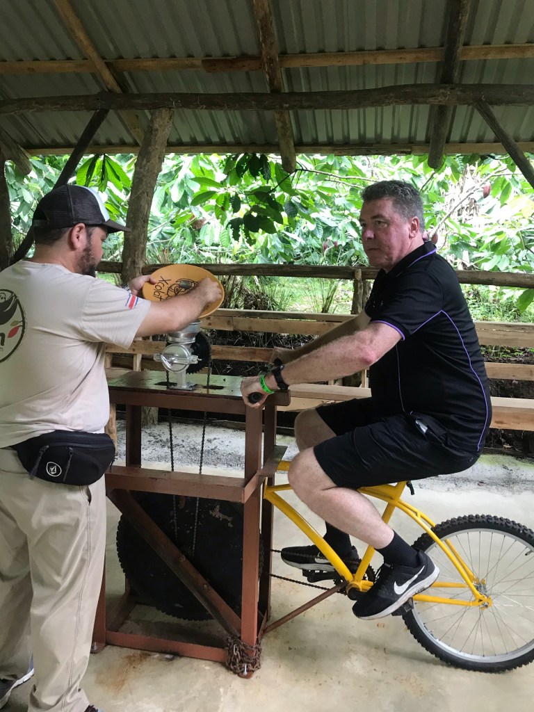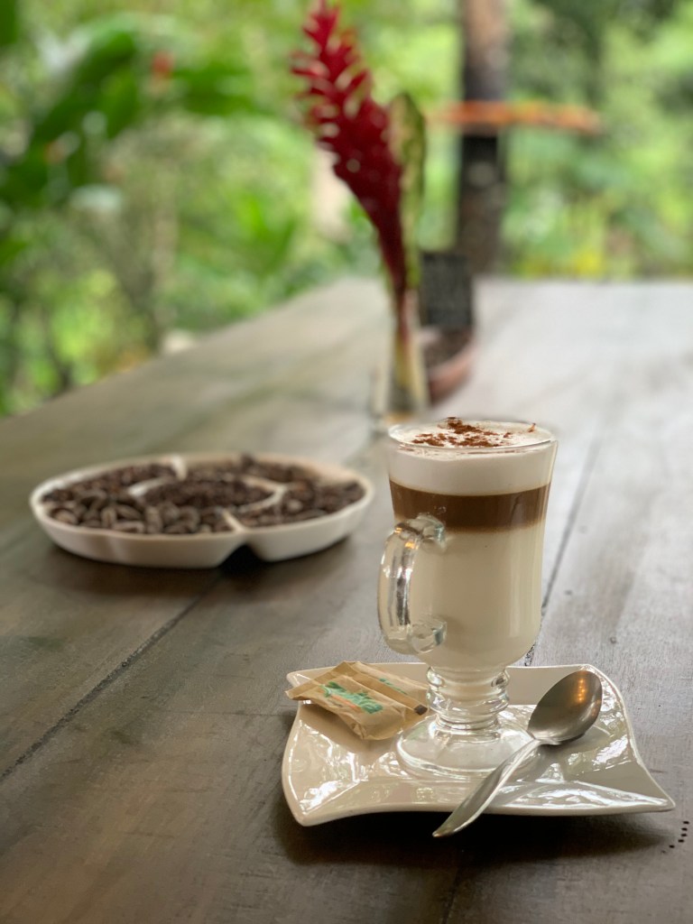 Arenal reminds me a bit of some of the alpine towns in New Zealand. There are many adventurous things to do, like white water rafting, canyoning, tubing and crazy hiking. As we had a spare morning we opted to go to an organic chocolate farm, our kind of adventurous. It was a fantastic experience as our guide took us through the whole process from ‘paddock to plate’. We started with a coffee and Deb had a hot chocolate, successfully ordered in Spanish … Chocolate Caliente 🙂