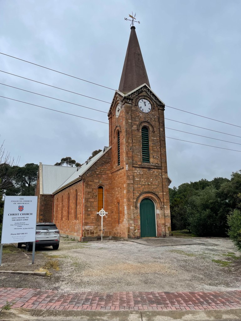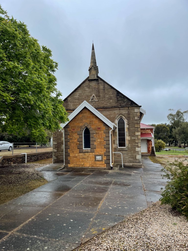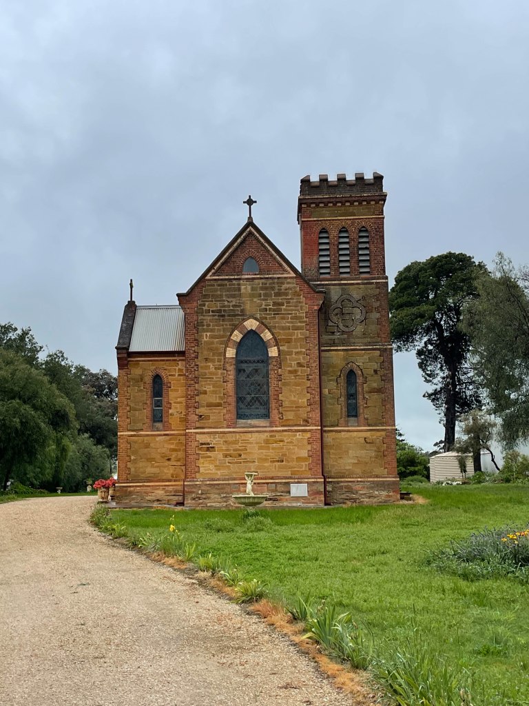It was still pretty rainy this morning in Clare and the creek at the back of the apartments was still swollen with the extra rain of the last couple of days. The cloud was low so it was a misty drive back to Mintaro to see if we could get to see Martindale Hall. Unfortunately, their driveway bridge was still flooded, so Martindale will have to wait for another time. I had also hoped to take some drone pictures of the valley, but that wasn’t going to work either.