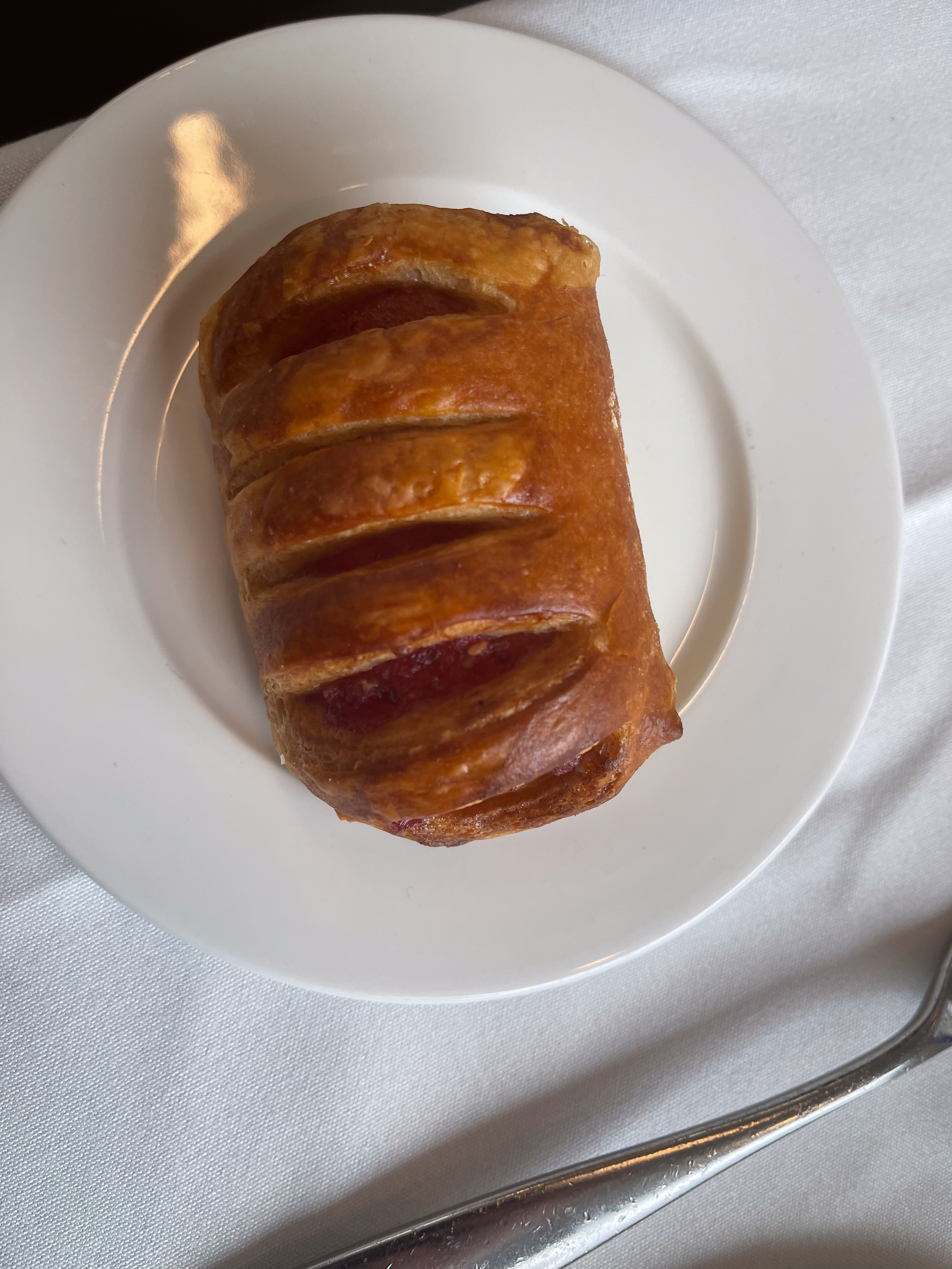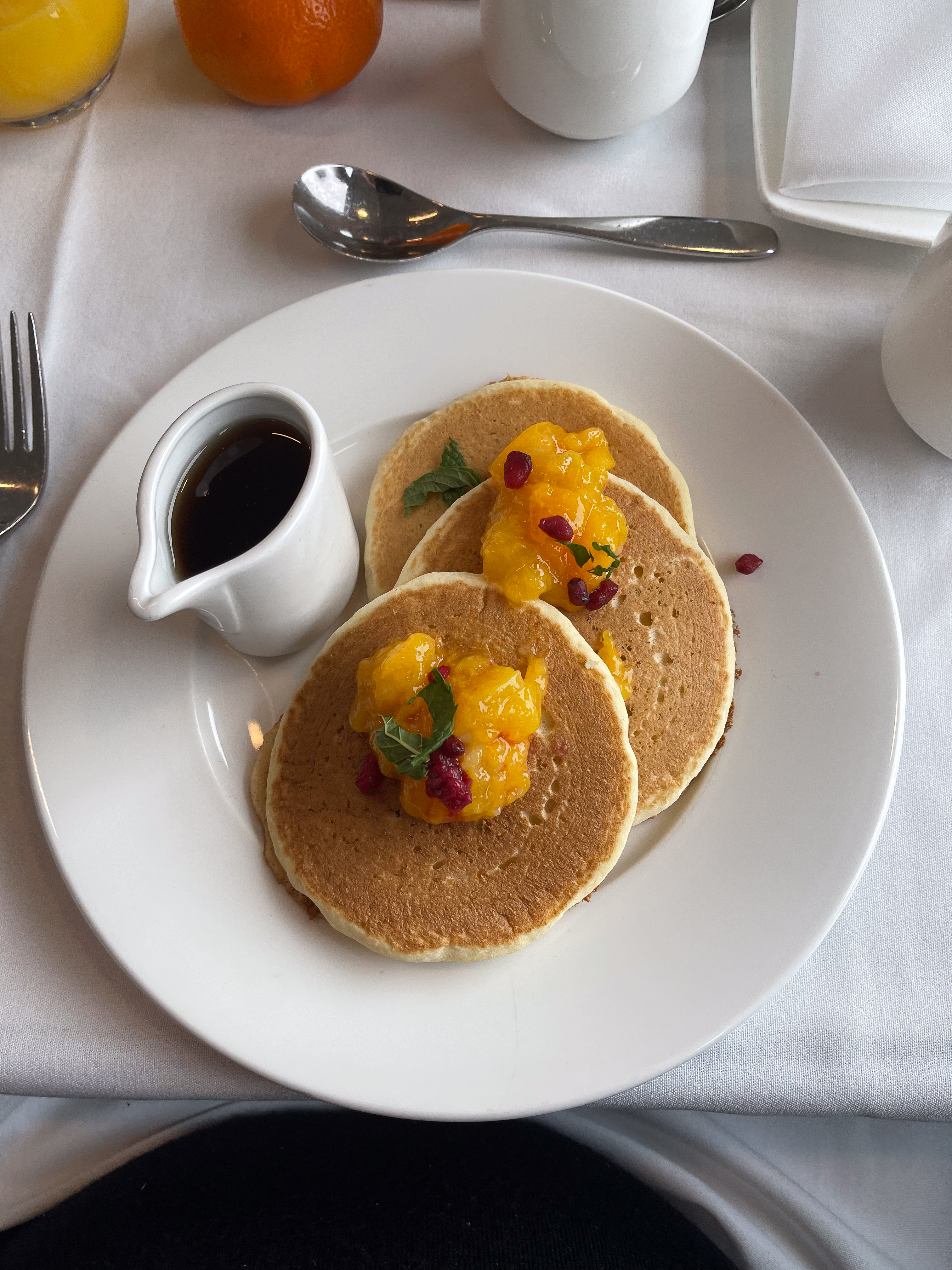 We were on the second serving today, so didn’t get breakfast until we were well up Kamloops Lake and then the Thompson River. Today we both opted for the pancakes to go with the standard fruit platter and a pastry. Just to be clear though, they do provide a sustaining coffee and some cranberry muffin while you wait, so there is no starving involved