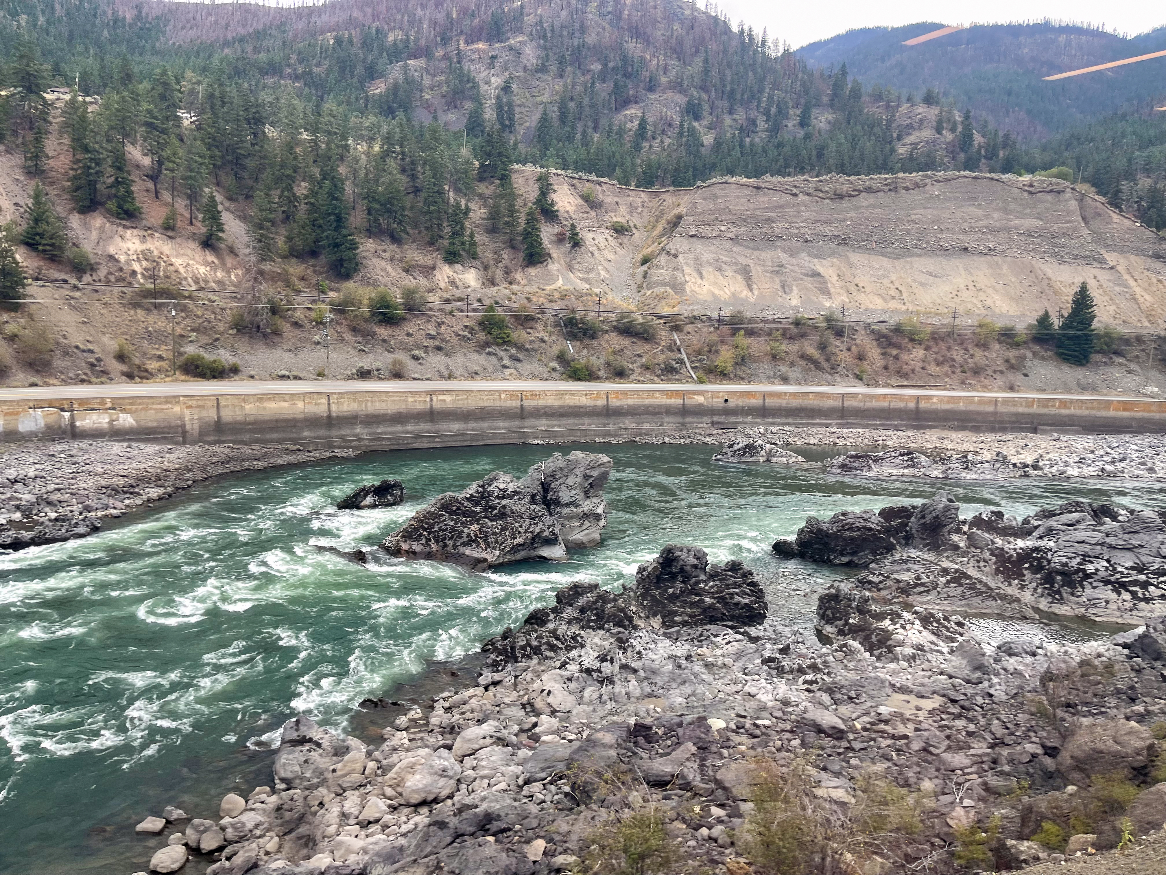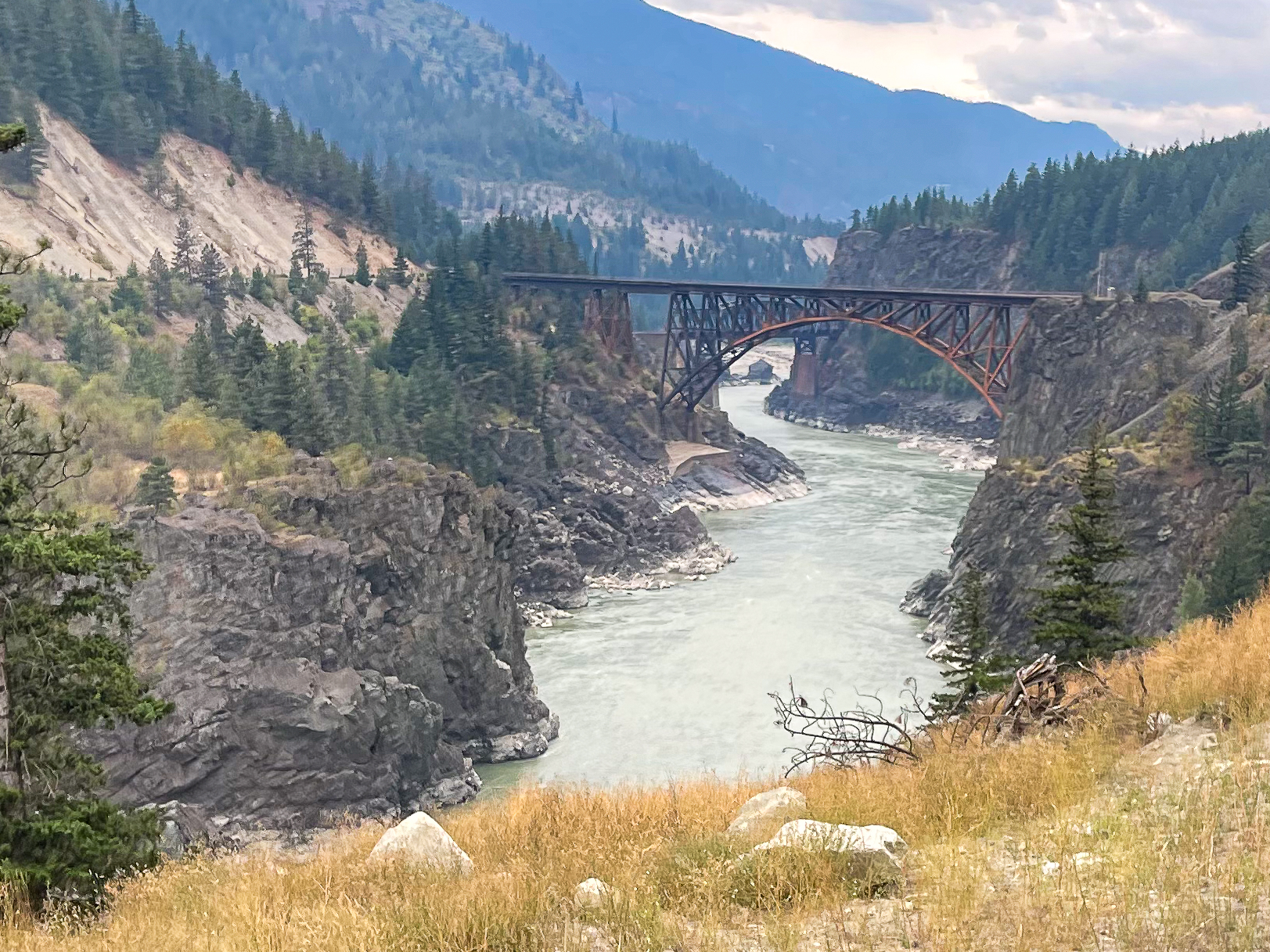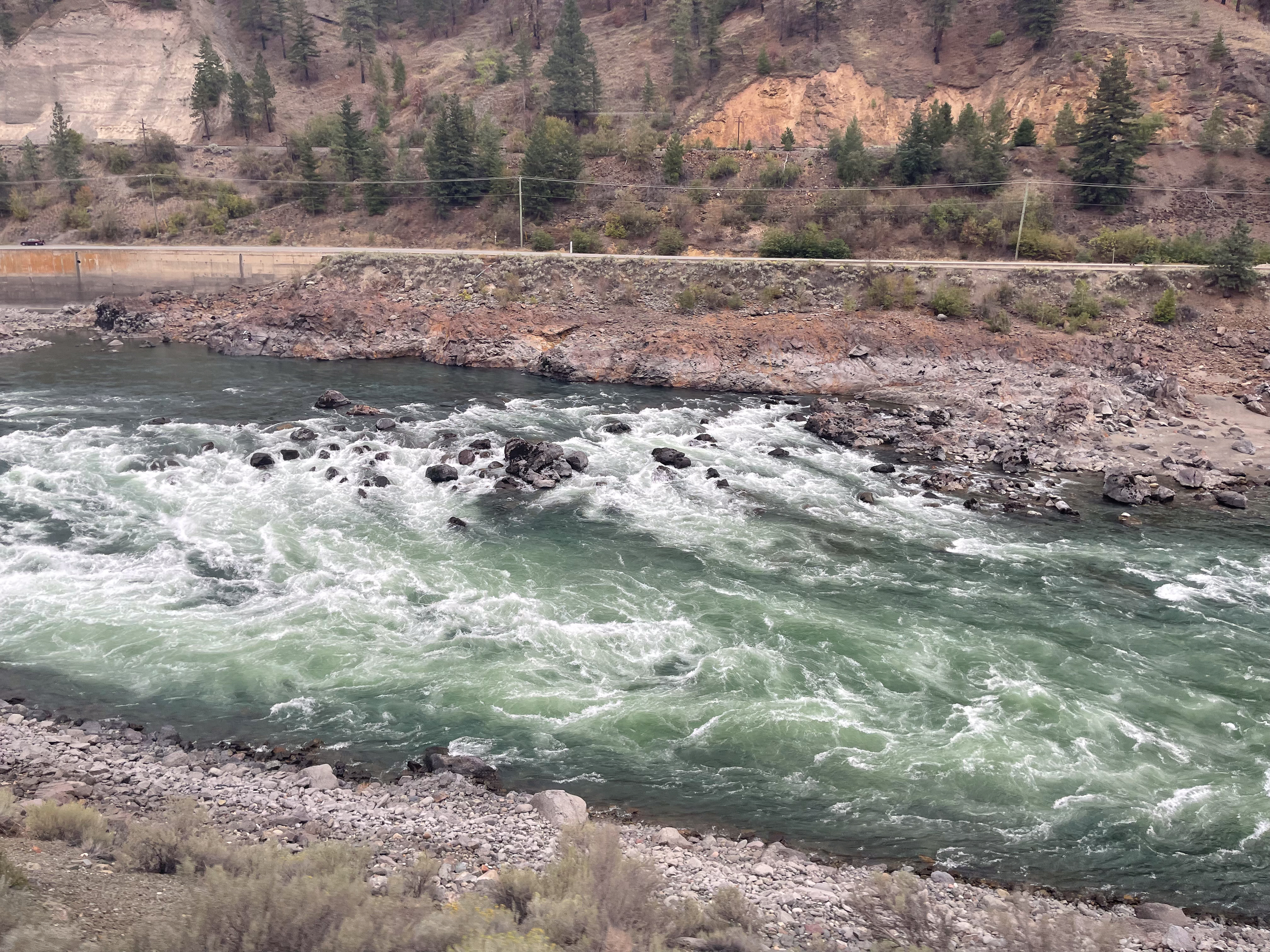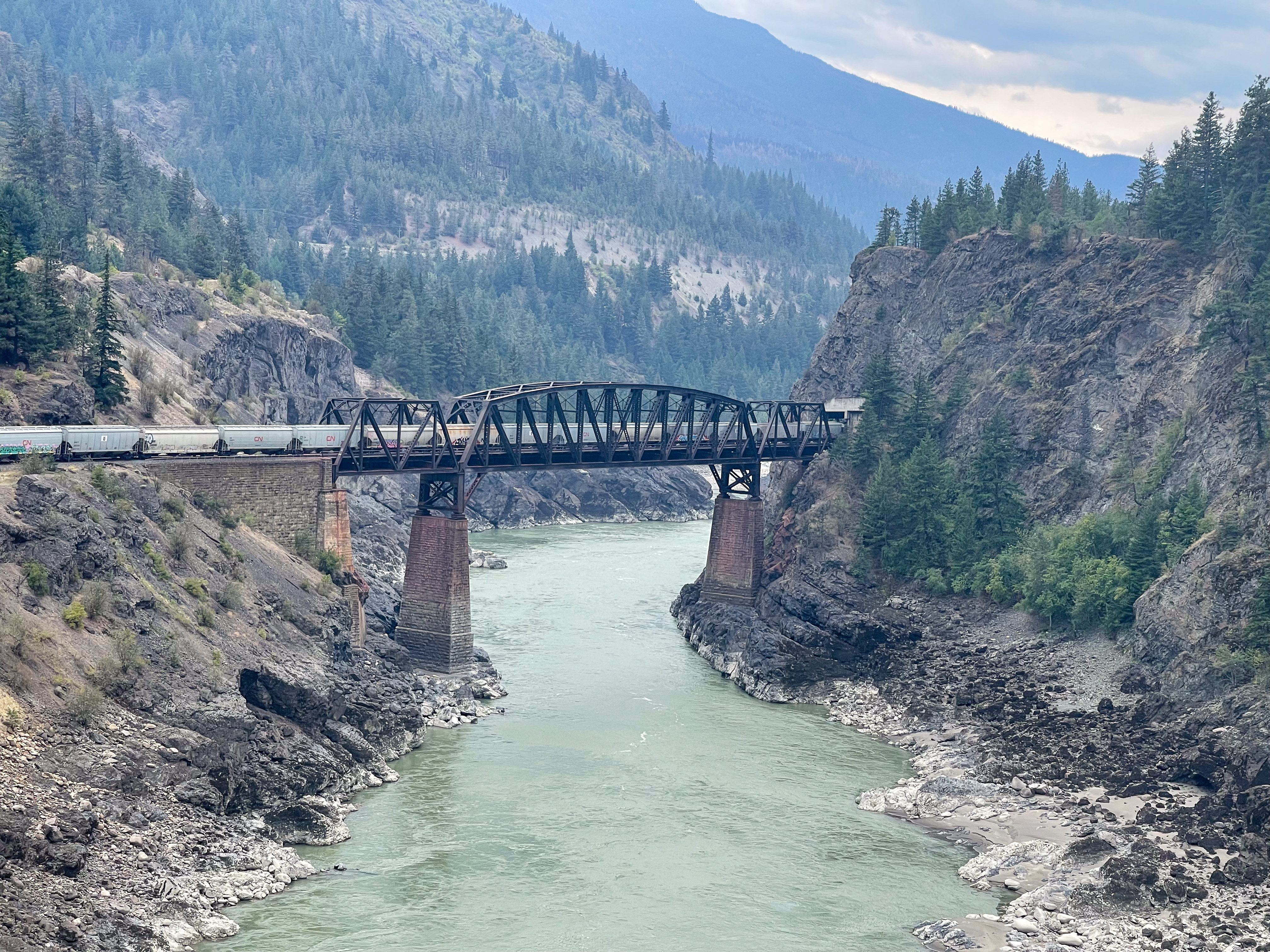 The train sticks to the Thompson River through lots of canyons until it eventually meets the Fraser River, where the clear water from the Thompson meets the muddy water of the Fraser. At Fraser Canyon, the Canadian Pacific and Canadian National railways meet and cross the Fraser River.