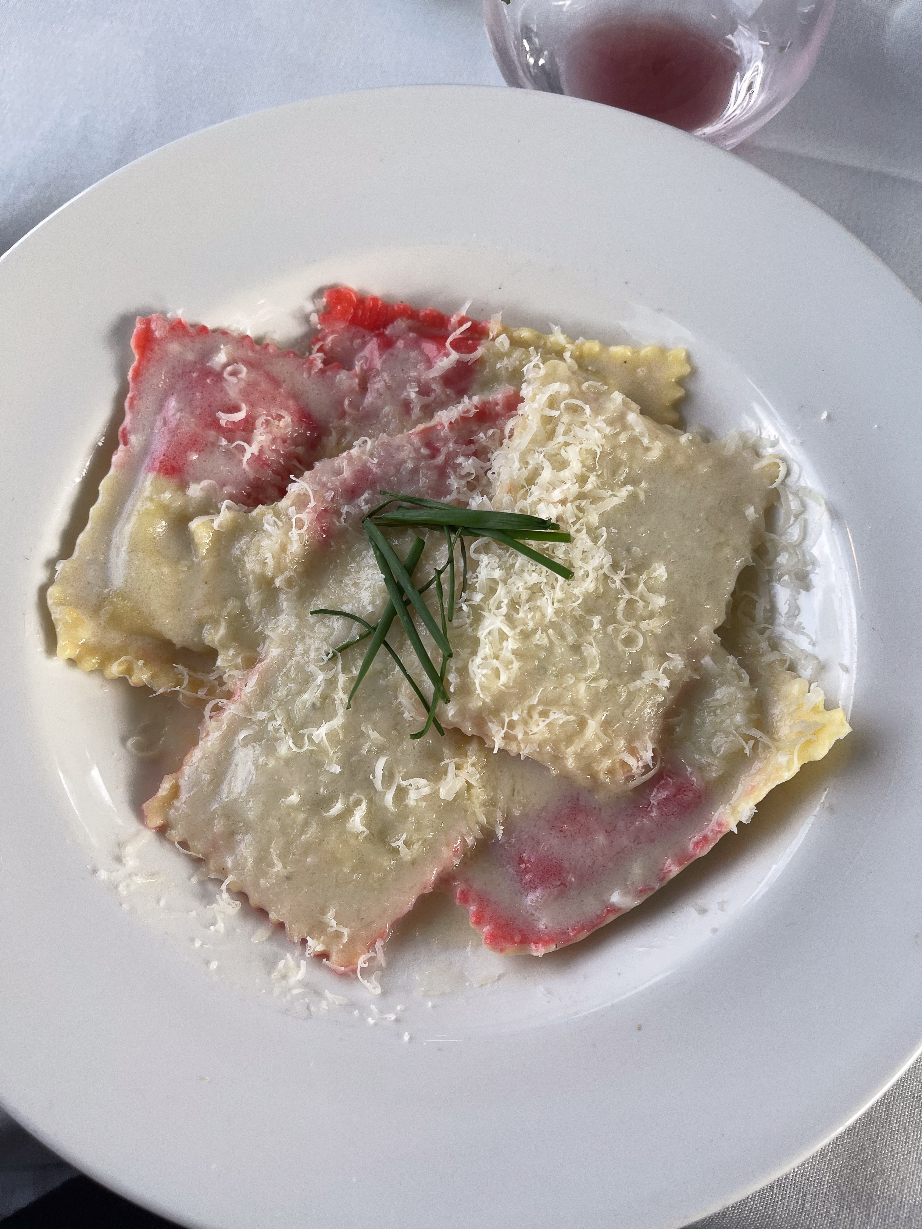The route follows the Fraser River all the way into Vancouver. For our lunch sitting, We started with a seafood charcuterie board and then I had the Crab Ravioli while Deb had Salmon. We shared our lunch with another couple from Dallas, Texas for another round of good food and conversation.