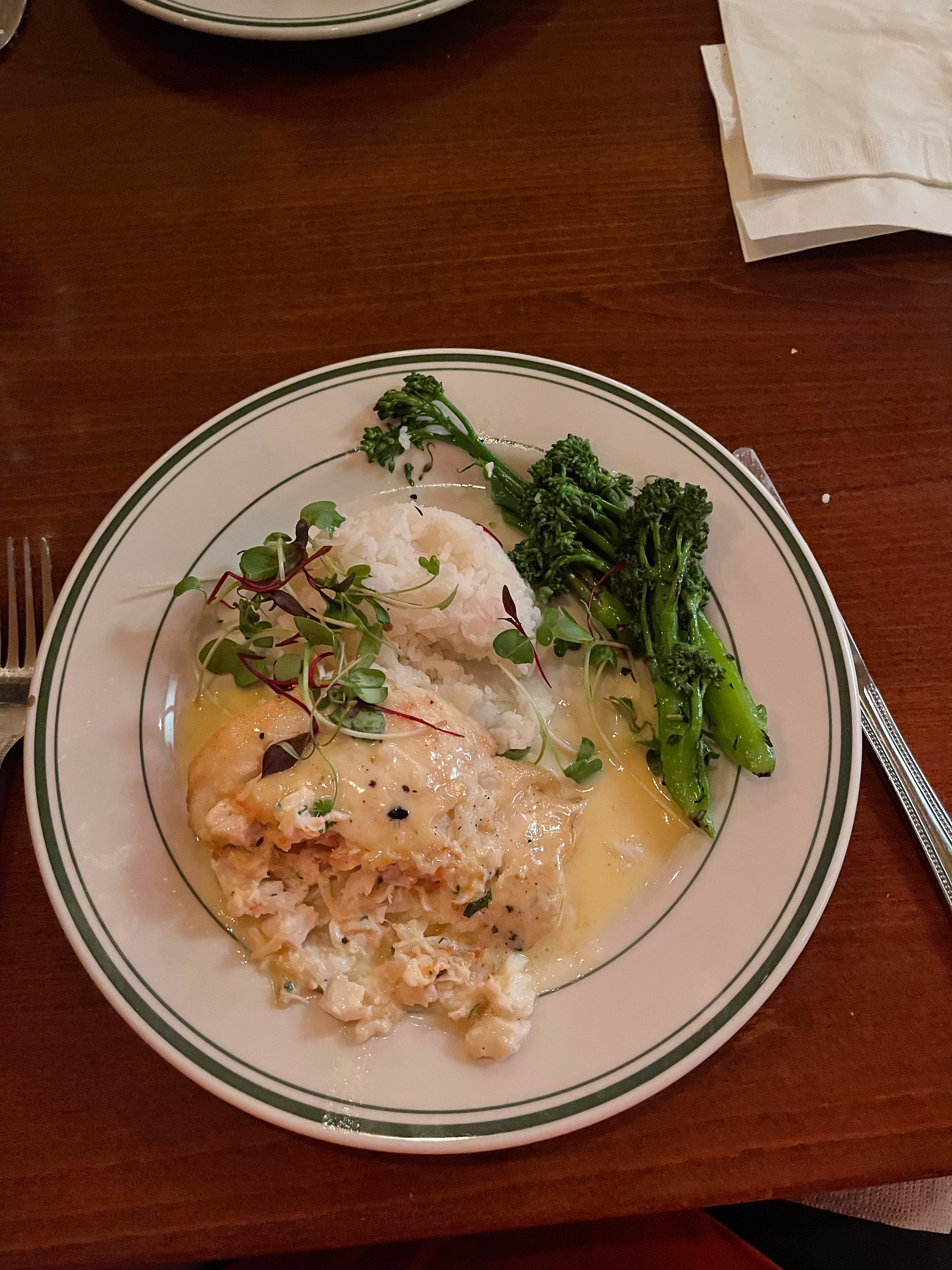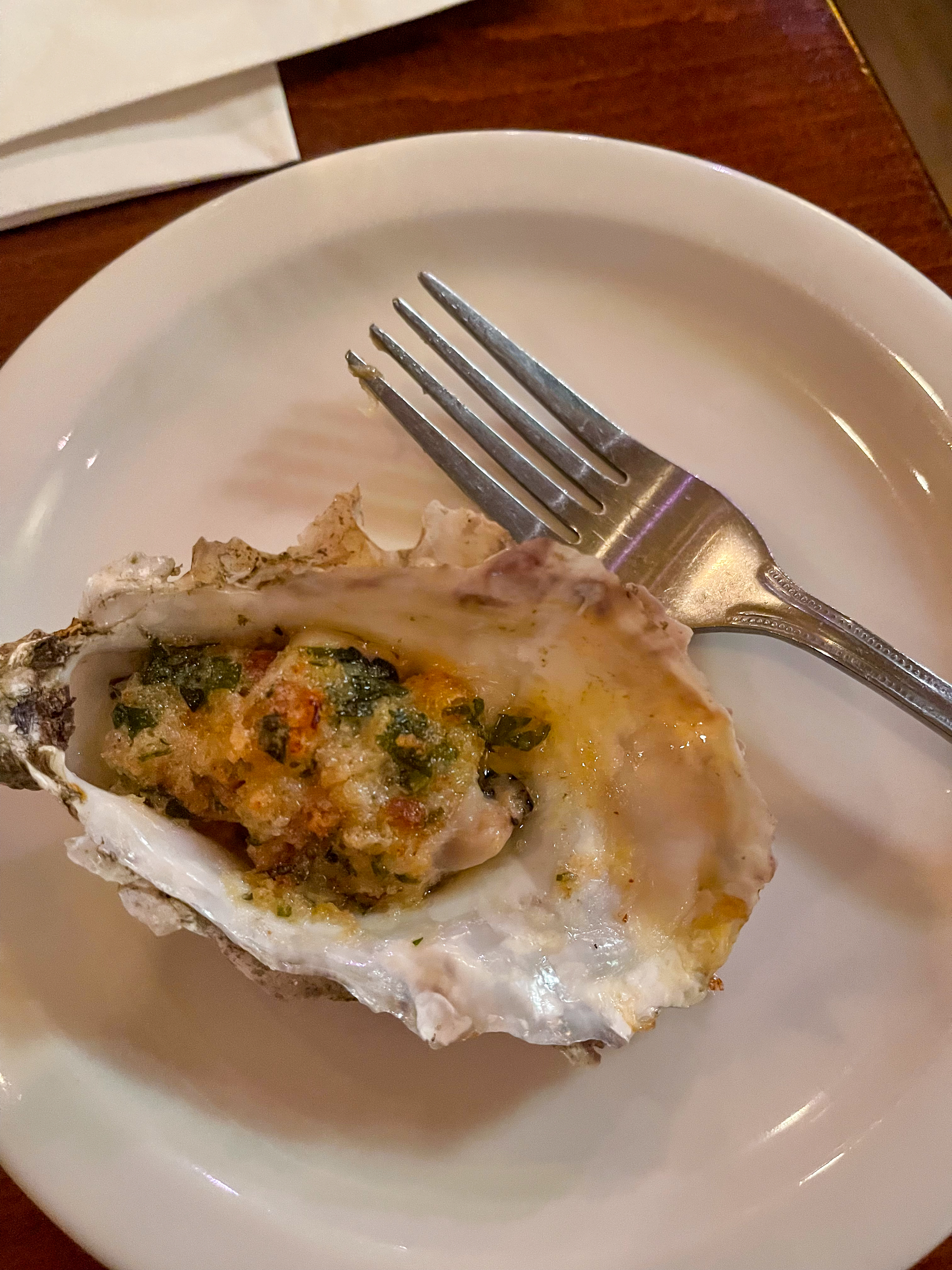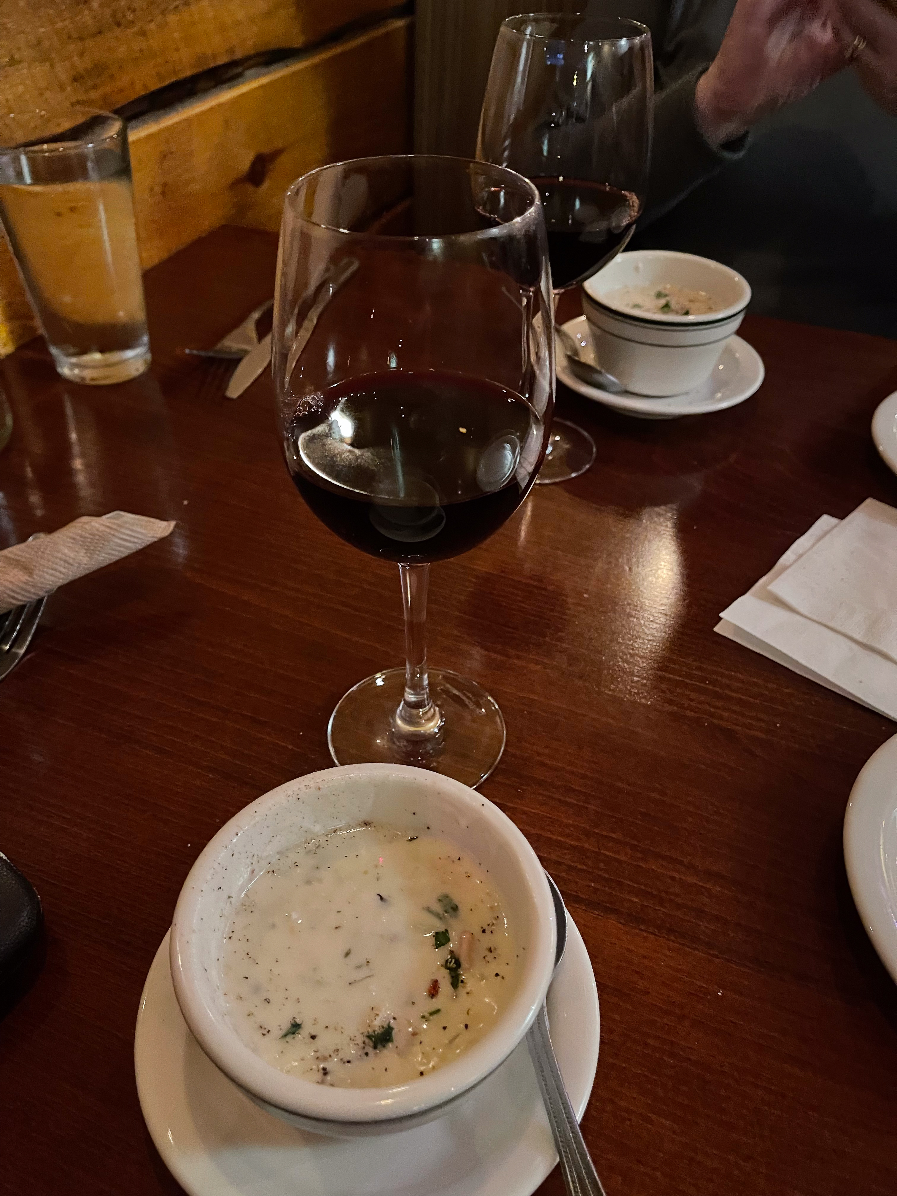 We had dinner at a local restaurant which had amazing food. This was one of those rare occasions where we both ordered the same thing end-to-end. Grilled local oysters, clam chowder (best ever) and some baked Halibut with king crab.