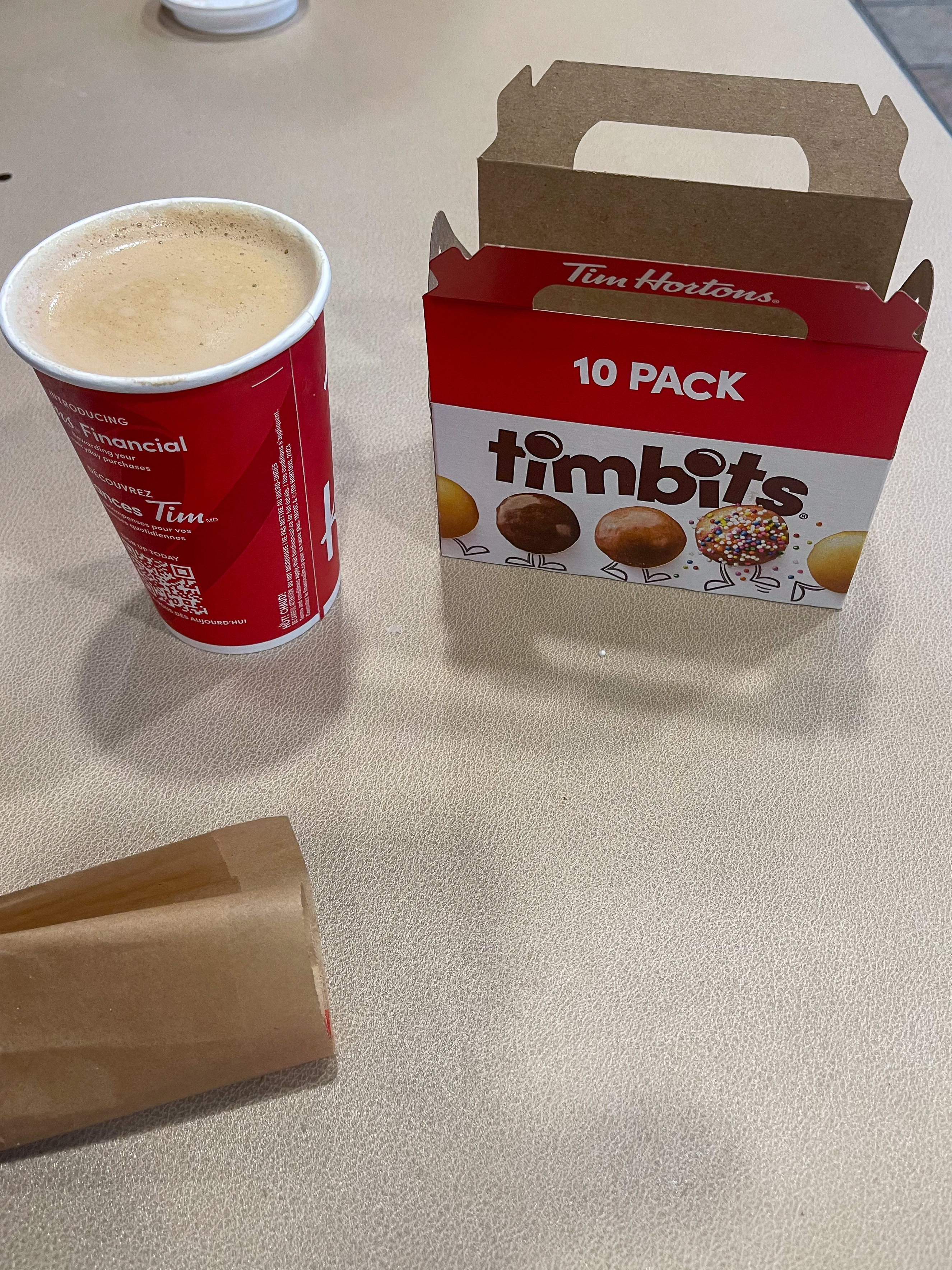 A lot of the youtube videos we watched before coming over here featured Tim Hortons as a breakfast option. Tim Hortons was started up by a Canadian hockey player (Tim Horton) and a business partner in 1964 and was owner operated until Tim died in a car accident in 1974. Another business partner, Ron Joyce took the reins after Tim’s demise and they have since merged with Wendys and Burger King and are now largely owned by a Brazilian investment firm. There was a Tim Hortons outlet next door to the hotel, and considering my acquired dislike for hotel buffets we thought we’d give it a go. I had a Canadian Breakfast sandwich (ooops… no photo) and we shared some Timsbits, which are the holes from the donuts. With an extra shot the coffee was fine, but super hot as it always seems to be in Canada.
