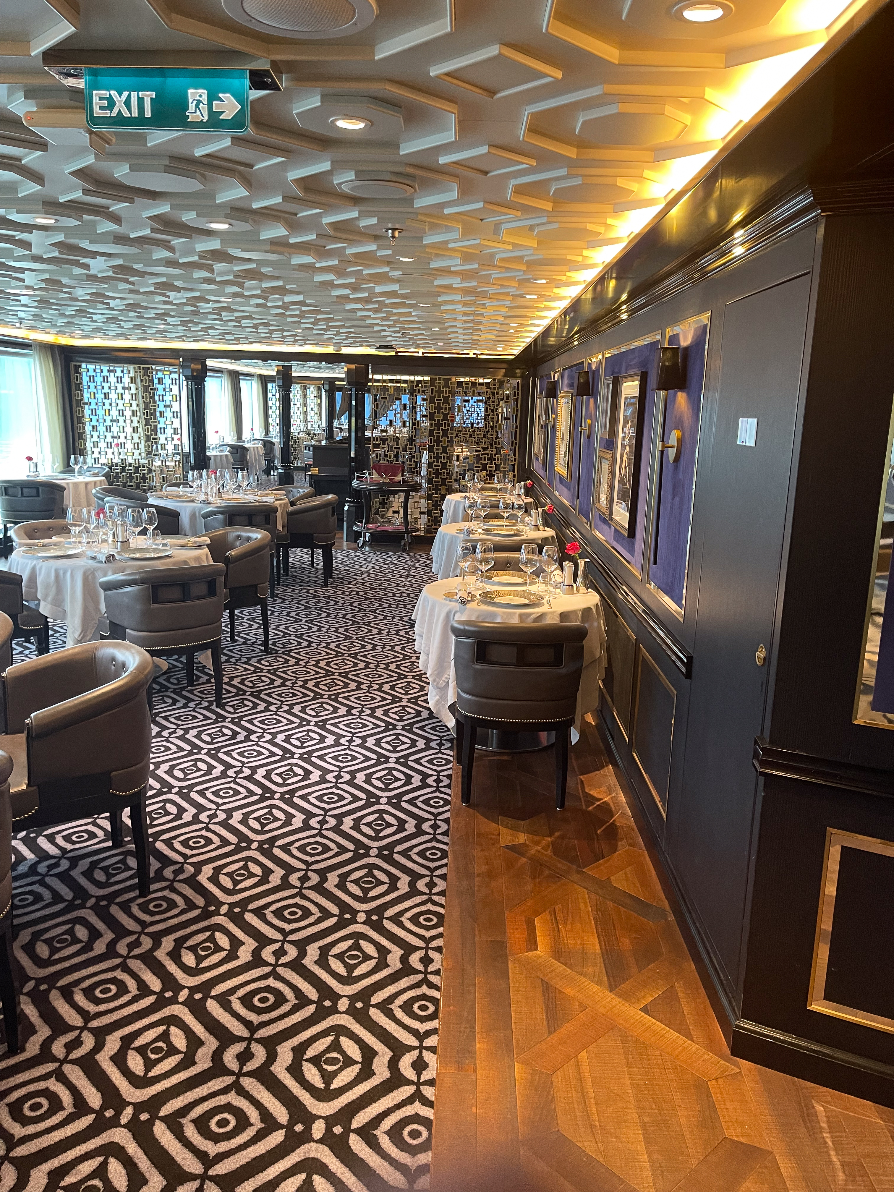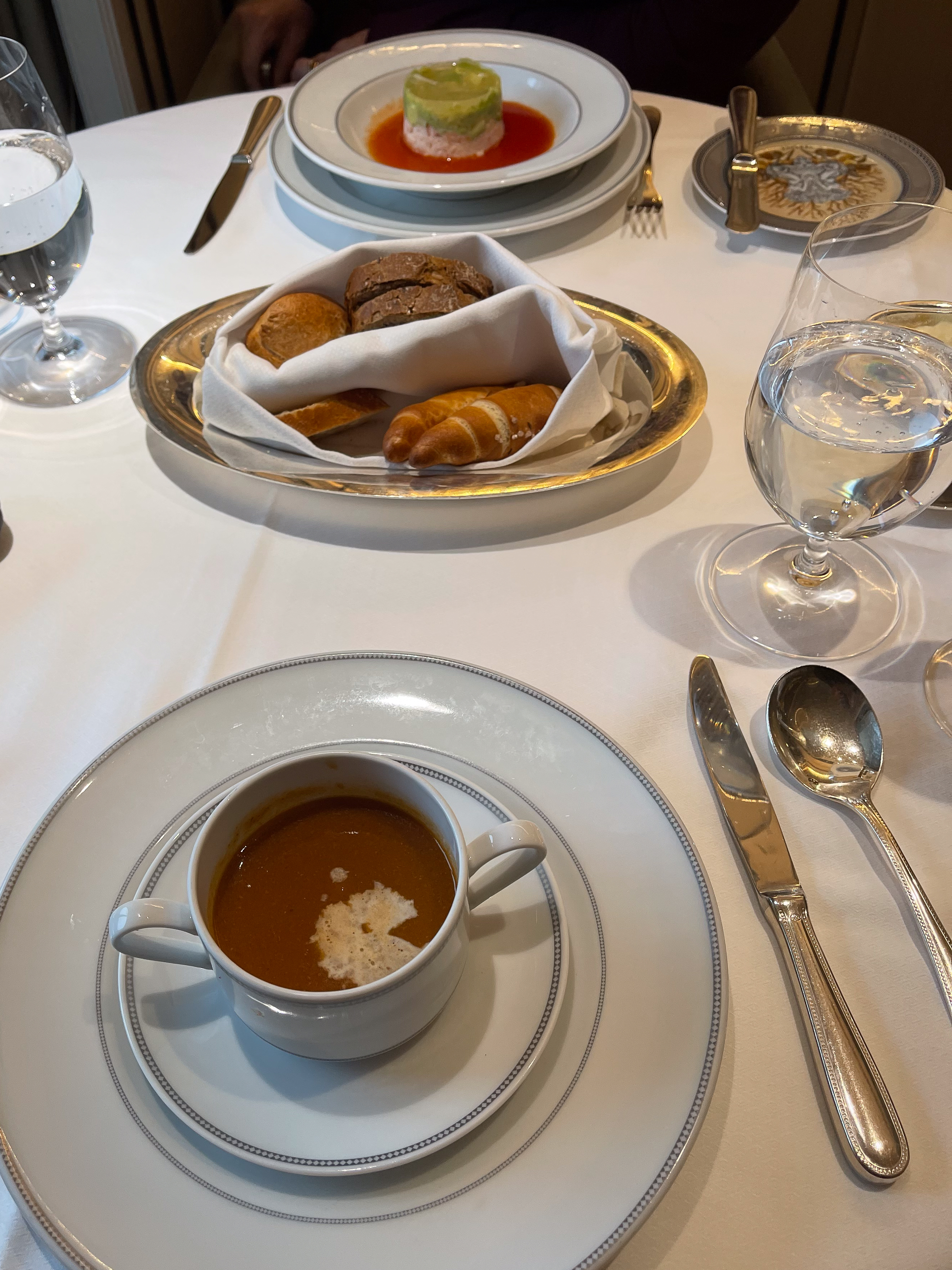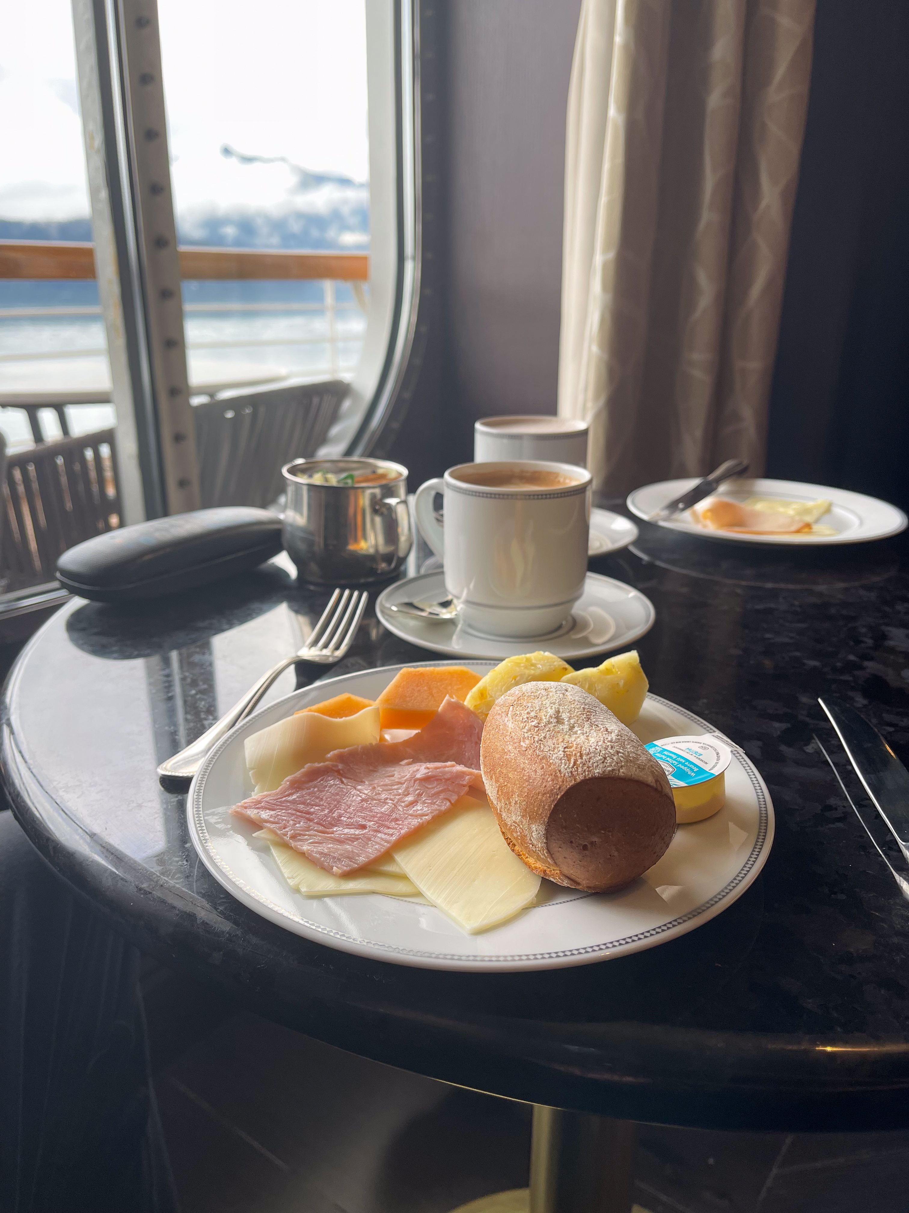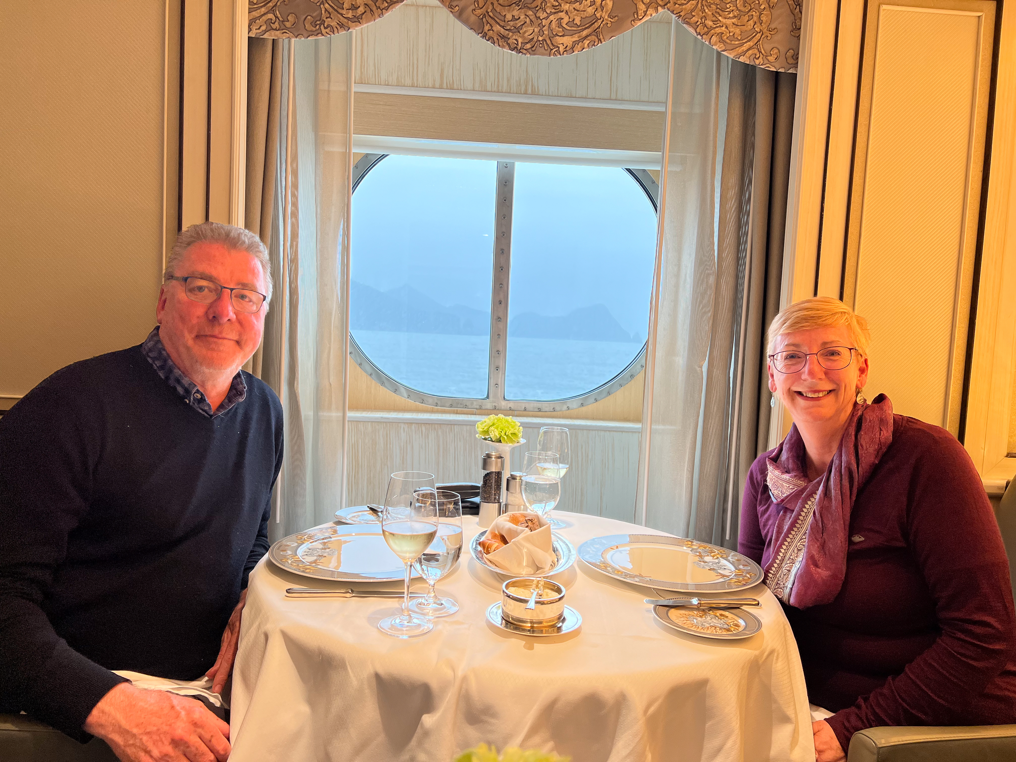 Unfortunately, the weather has turned bad here and 55 knot winds are expected so we won’t be going to Hubbard Glacier. This is disappointing, but one cannot control the weather, so tomorrow is likely just a day at sea. There will be plenty of good eating to be done. Tonight we had dinner at Compass Rose which is not one of the ‘flash’ restaurants on board, but was amazing all the same. I had Lobster Bisque and the Scallops in Lemon Creme sauce while Deb had a Crab and Avocado starter and Lobster Tail in Herb Butter main. We both had a Kahlua Souffle with caramel sauce for dessert.