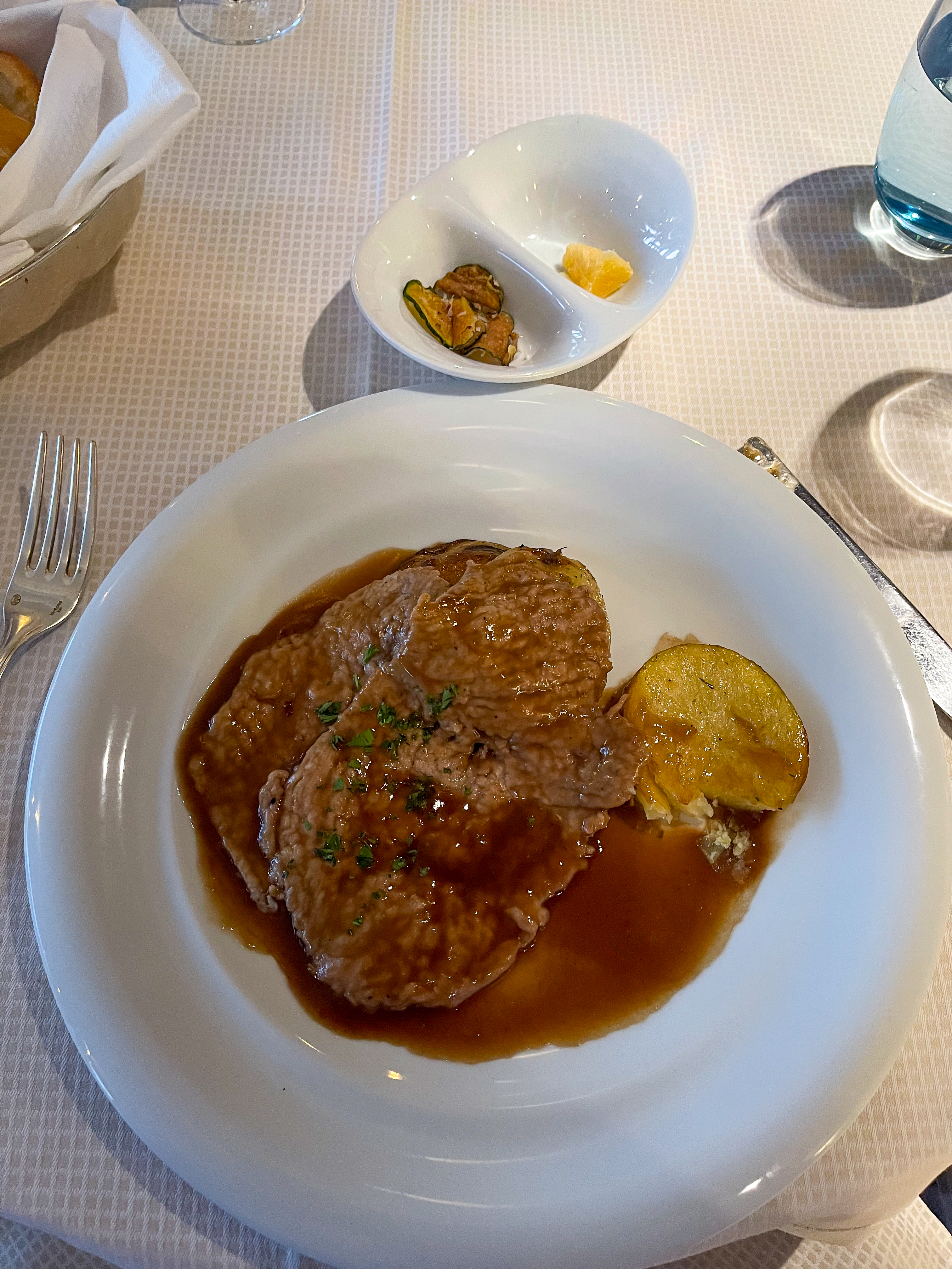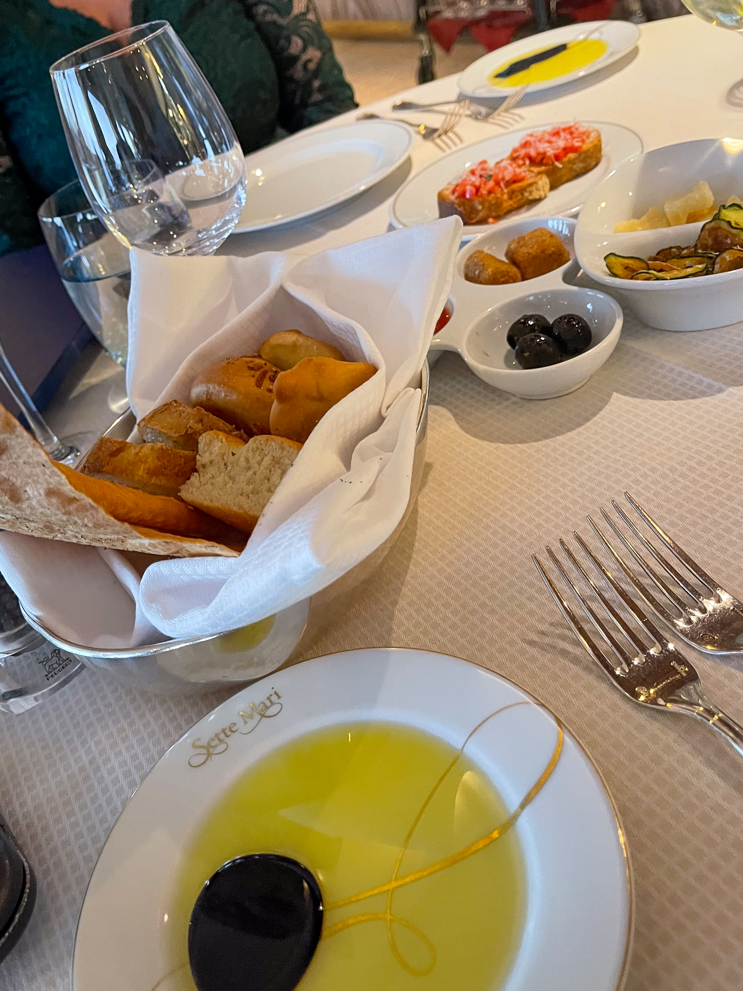 We thought dinner tonight was at Pacific Rim, an Asian-themed restaurant, but apparently that is tomorrow night. My laptop is still on Australian tIme , so that had confused me. We quickly changed plan and ate at Sette Mari instead. It has an Italian theme and with the generous antipasto platter we really only needed to order a main, which we both had the Veal Scallopine al Masala. Again the food was excellent.