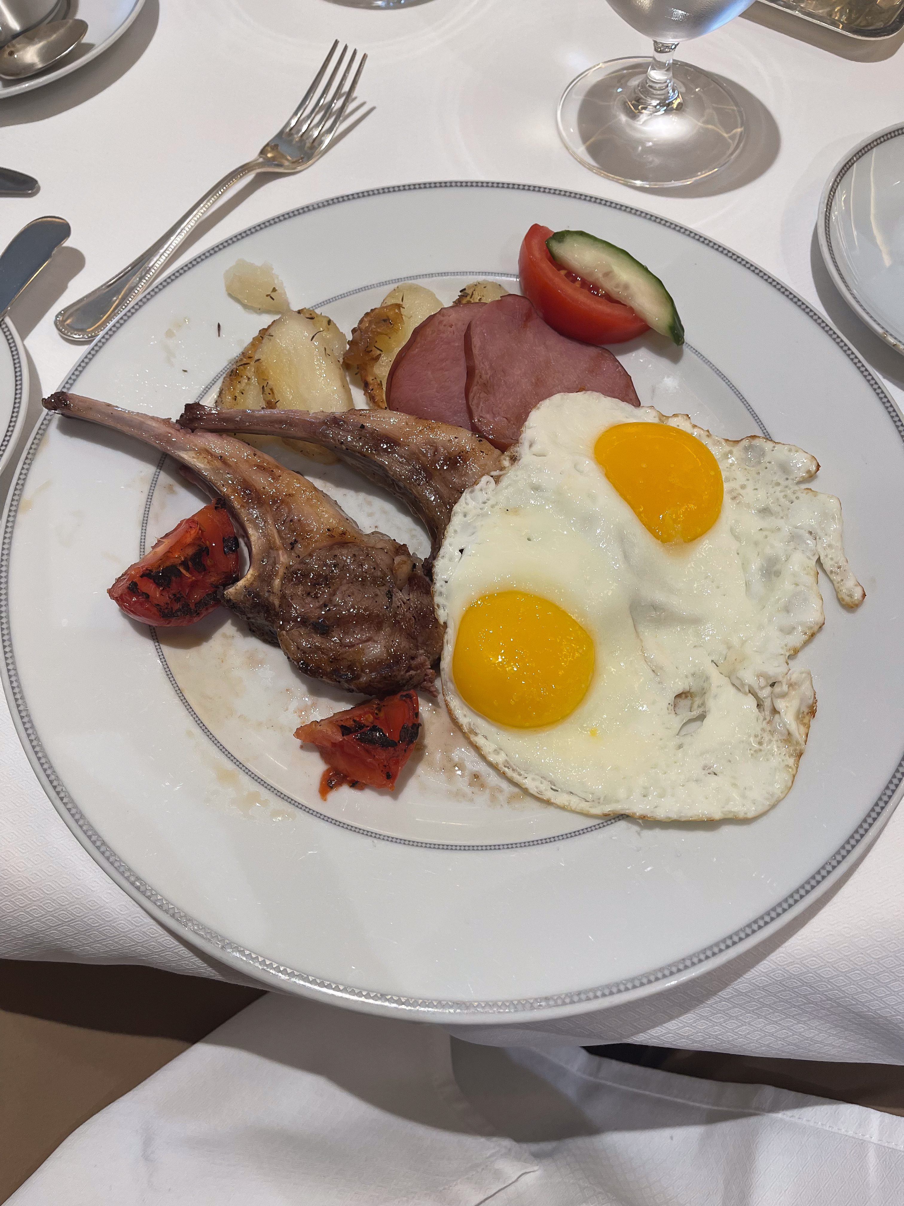 We started off with breakfast which was really only a consideration for me. Deb was up to a smoothie, but for me a breakfast favourite of eggs and lamb chops was in store. As you can see … I liked it.