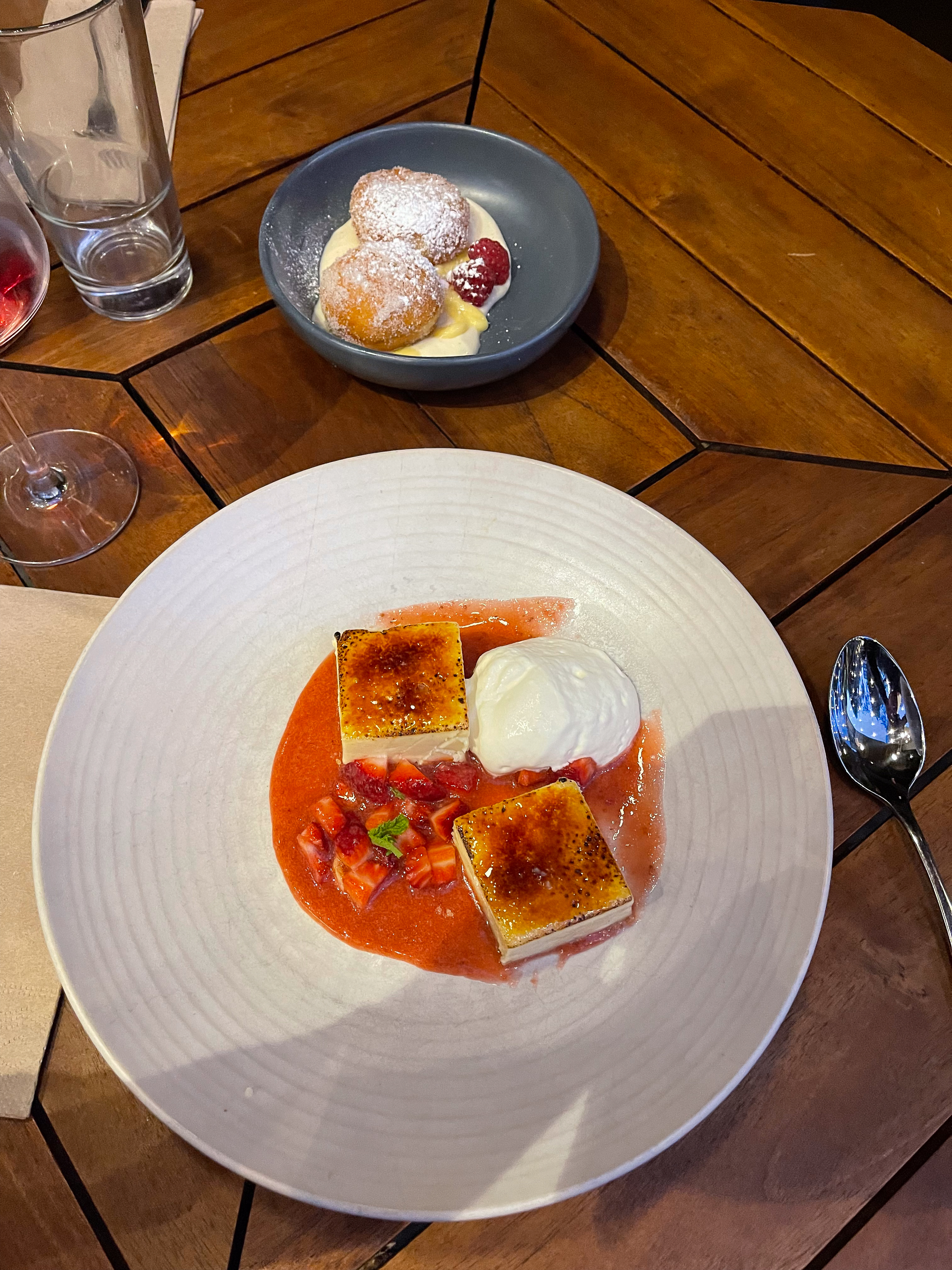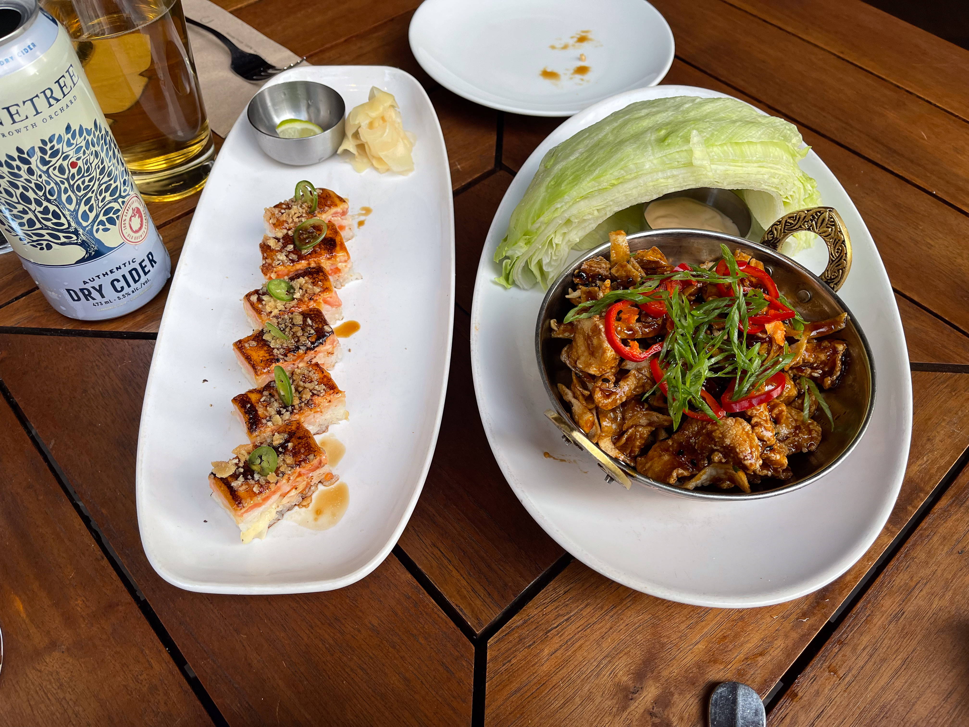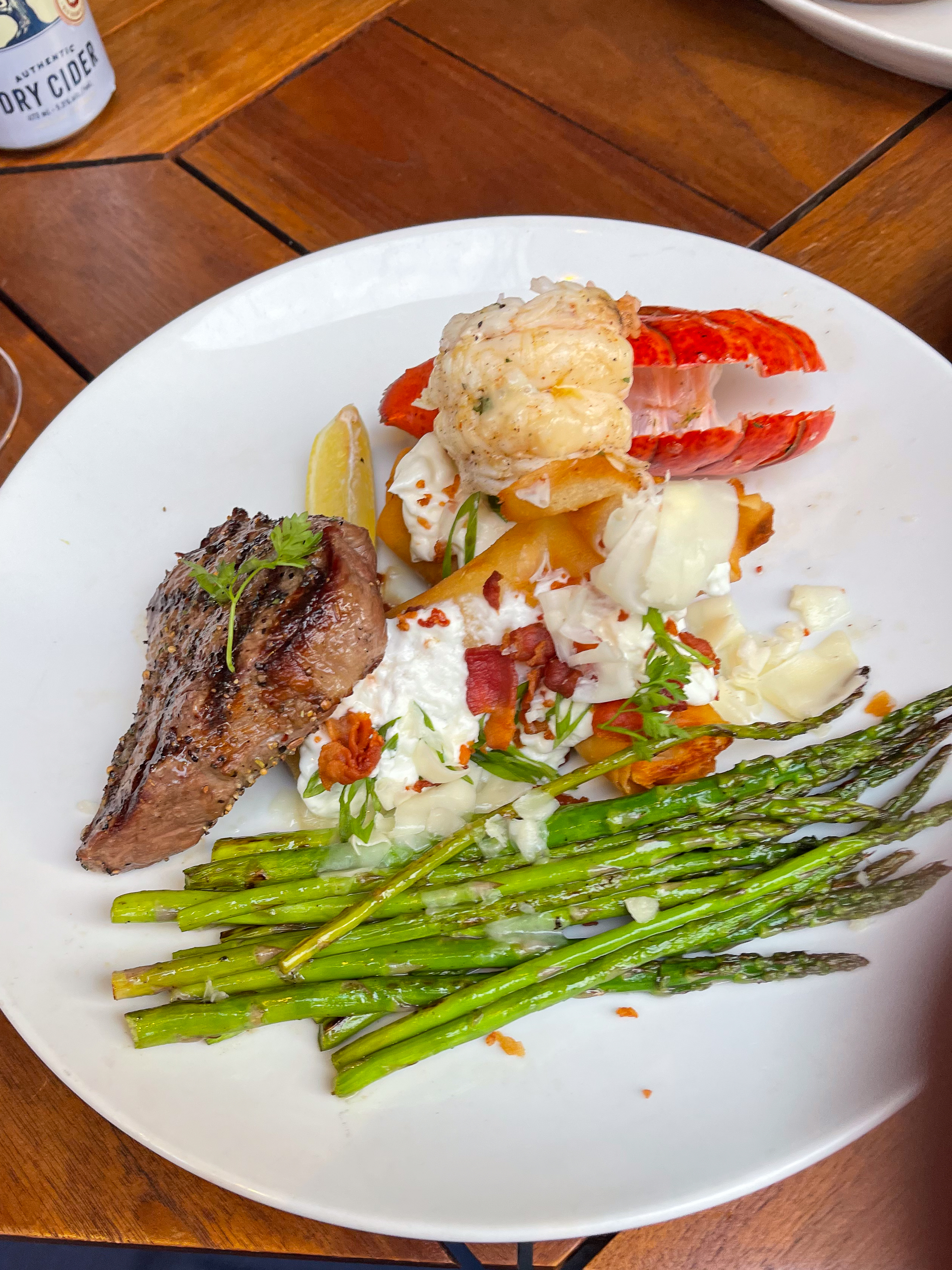 Dinner tonight was at Joey Burrard. It was an excellent meal where we shared some seared salmon sushi and sichuan chicken lettuce cups and then I had a sirloin steak with lobster while Deb had crab lump cake. For dessert I had creme brulee cheesecake while Deb had italian donuts with lemon curd.
