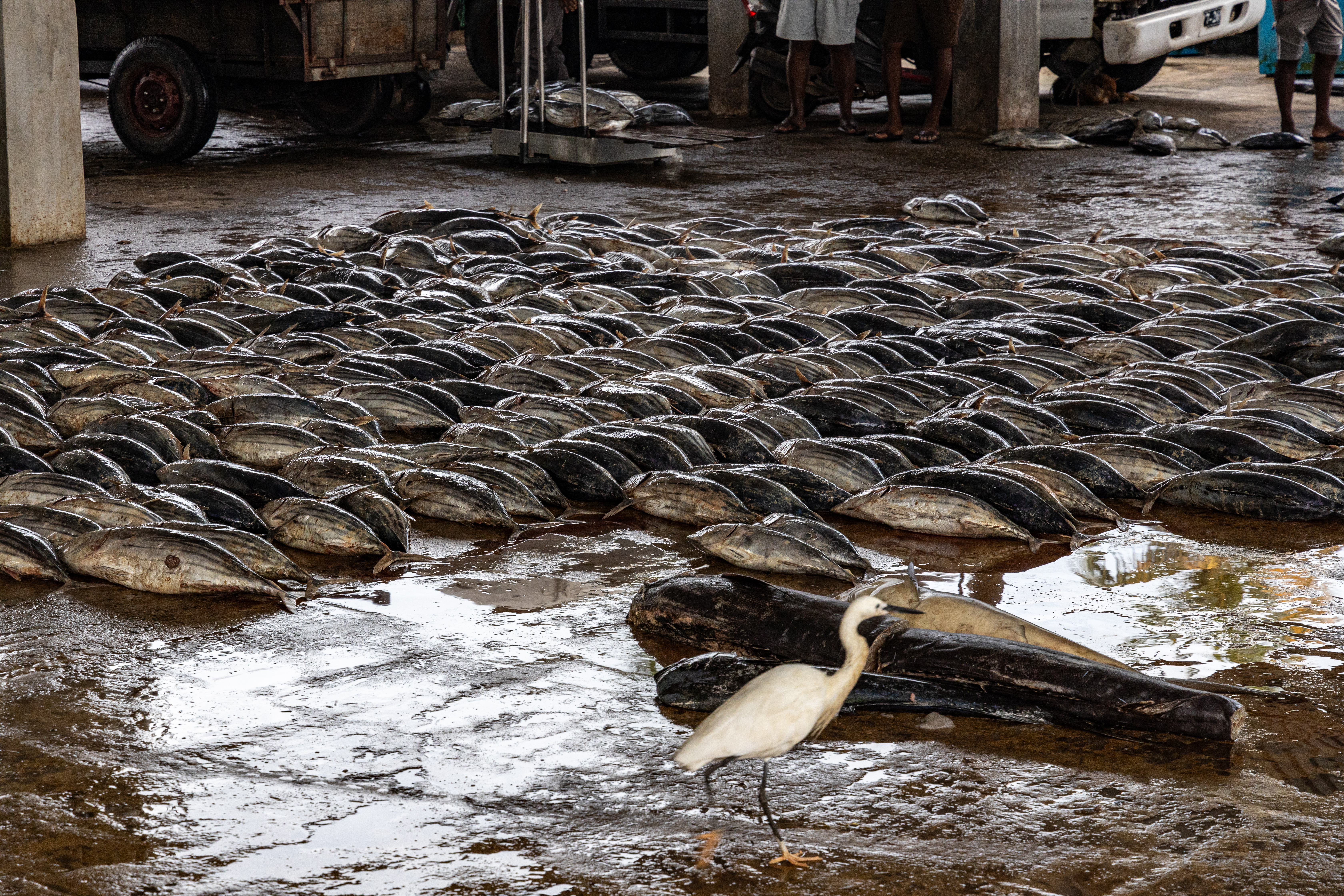 The fish markets were very busy at this time of day, and in a short time we were able to observe the entire supply chain, from selling, processing and then retailing. Once again, there is scant regard to food safety standards with many of the fish being strewn on the ground for the auction process. There are lots of small stalls where fish is cut up and sold to local people and restaurants. Some of the larger Tuna are shipped direct to Japan for sushi!