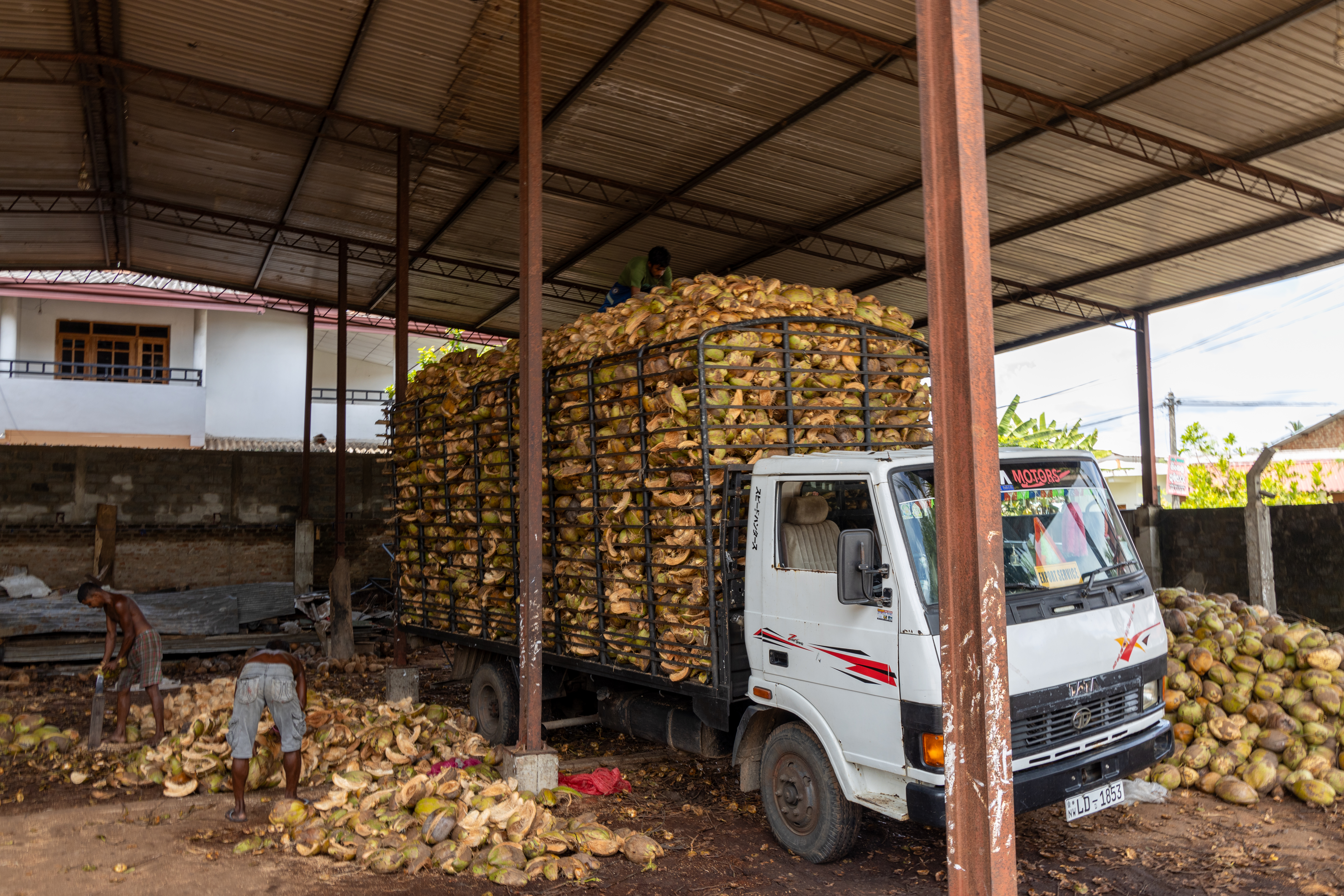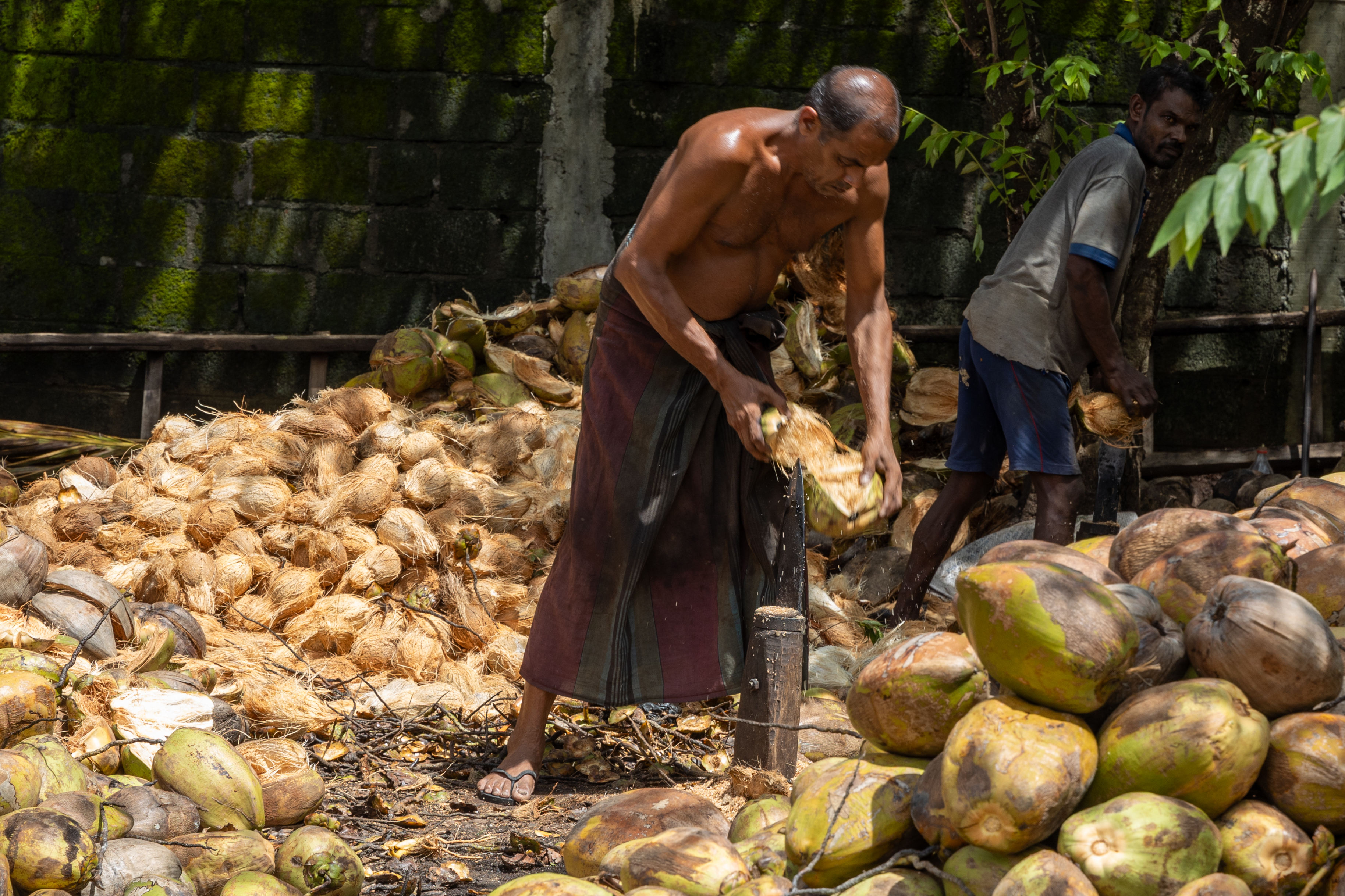 As we continuued our journey, we passed two cool things on our way. Firstly, we stopped at a coconut ‘husking’ operation, where the coconuts are broken apart and the husks loaded on trucks to be transported. The coconuts are husked using a tool that is like a stick embedded in the ground with a sharp blade attached and brute strength applied to split the husks. In Sri Lanka, the coconut palms have multiple uses from using the wood for building, the leaves for thatch roofs and the husks for mattress filling or garden mulch.