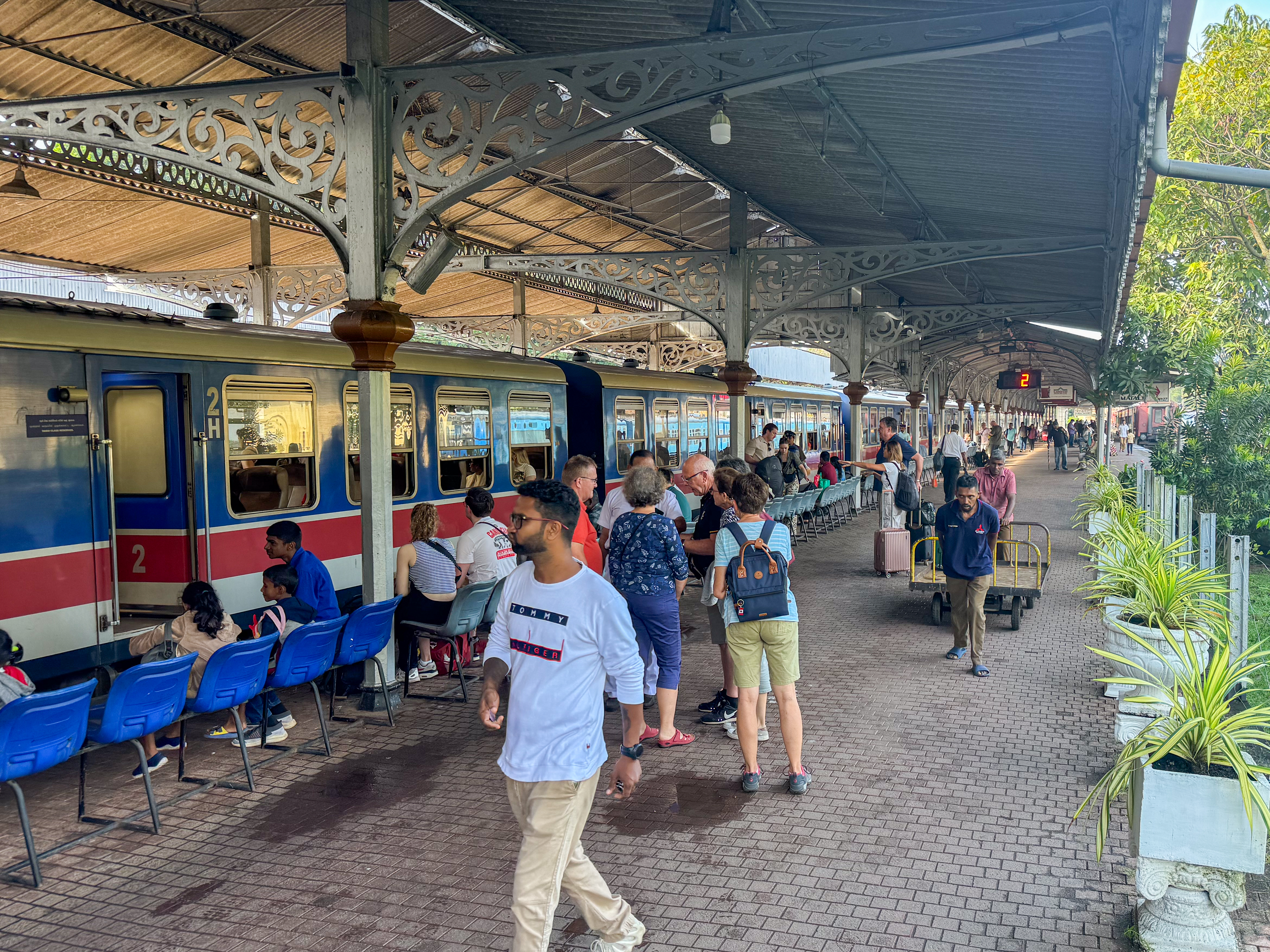 Our train was a bit late in, which I understand is not a rare occurrence. Our train followed the Main Railway Line from Kandy which then continues to climb through tea country, connecting local market centres at Gampola, Nawalapitiya, and Hatton before reaching Nanu Oya. This is the connection to our planned destination, the former colonial resort town of Nuwara Eliya, known for its temperate climate, classic hotels, and British-style gardens. The Main Line was extended in stages with service to Kandy beginning in 1867, to Nawalapitiya in 1874, to Nanu Oya in 1885.