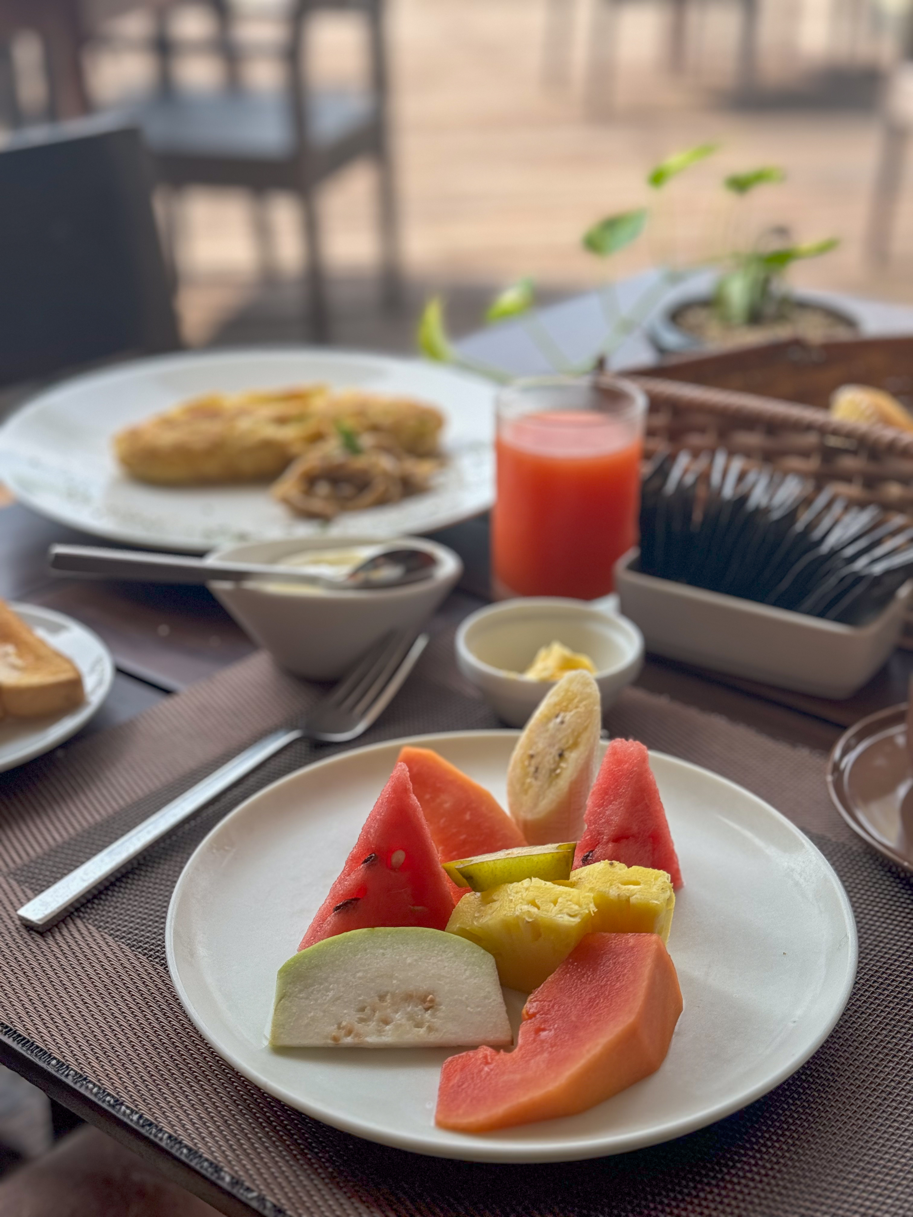 We were able to have a bit of a lie-in again this morning because we didn’t need to meet the bus until 10 AM. We are staying at the Le Grand Hotel which was opened in 2018. The hotel has great views of the Dutch Fort and the Indian Ocean and is the best of the hotels we’ve stayed in this trip. Breakfast was not the usual buffet, but a ‘set-menu’. We both had omelettes and fresh fruit platters as we took in the views.