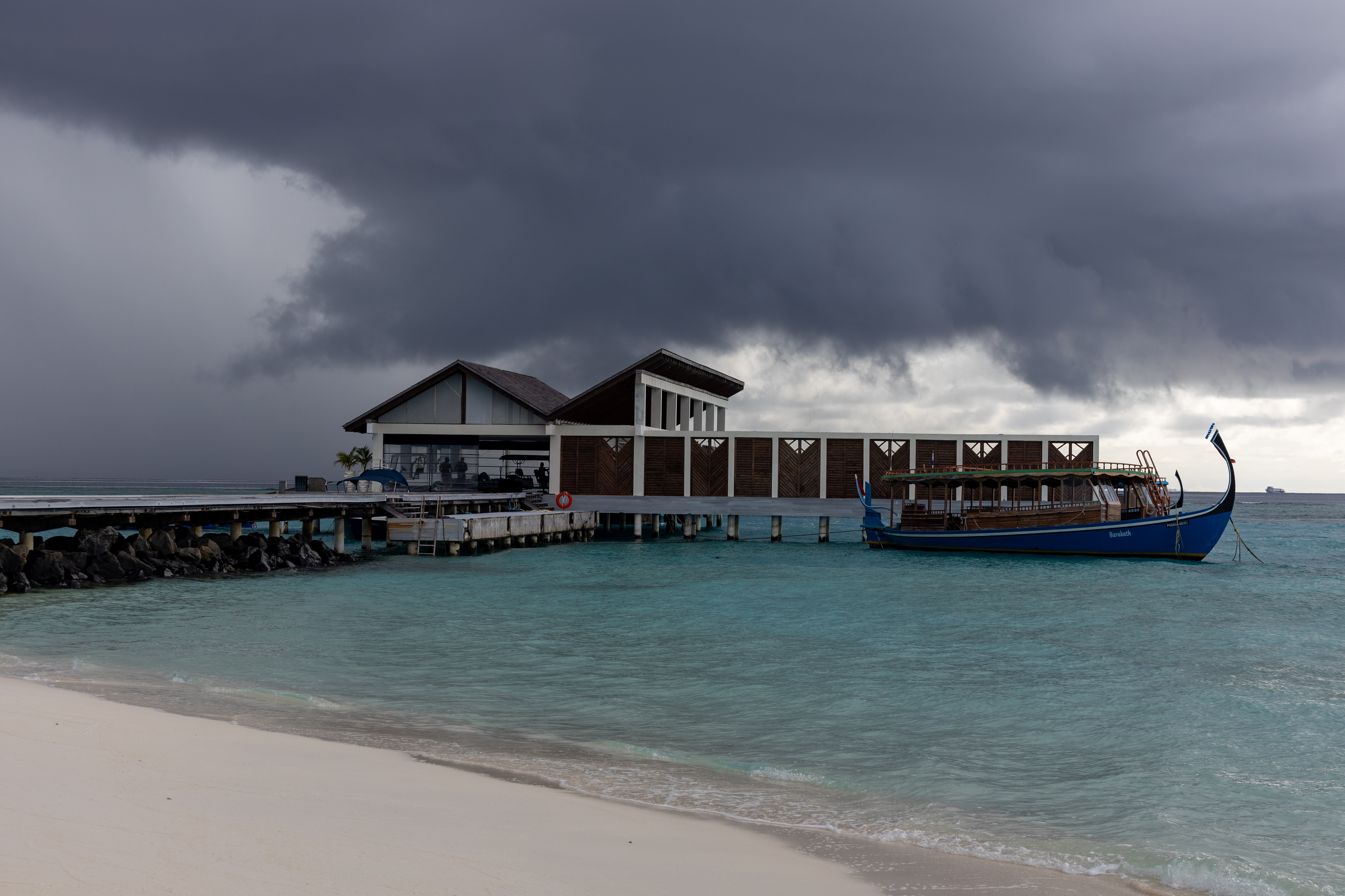 After breakfast we walked to the Dive Centre to see if we could do some snorkelling while we are here. We found that access to snorkelling gear is included in the room cost. As we left the dive centre we saw some dark clouds in the distance, but a morning storm blew in very quickly. We ran off the jetty, but unfortunately were soaked through within minutes.