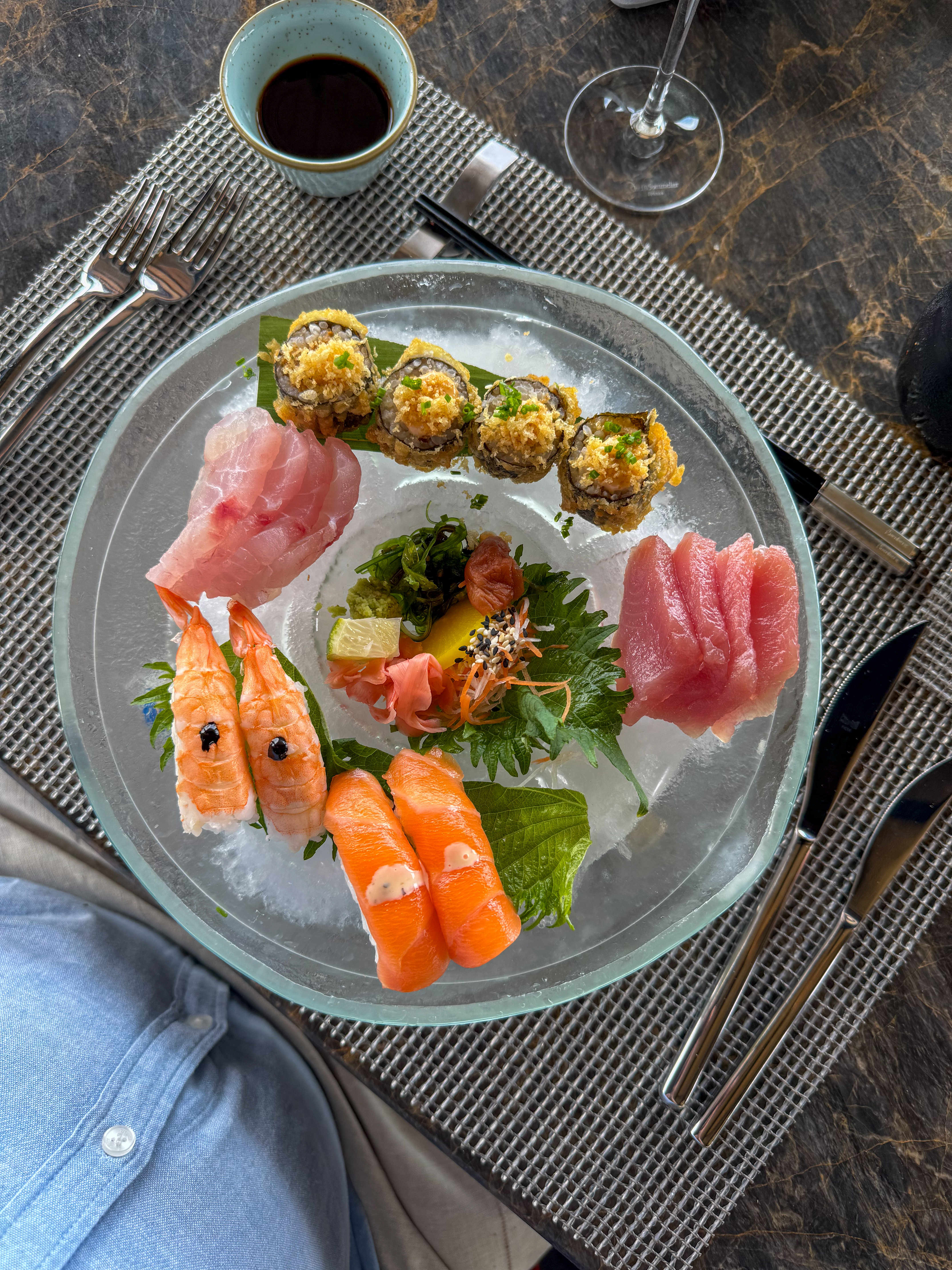 For lunch today, we visited the Japanese-themed restaurant and we both had a Sashimi and Sushi platter, followed up with a yuzu dessert. This restaurant is almost on the beach so the views are great as well as the food.