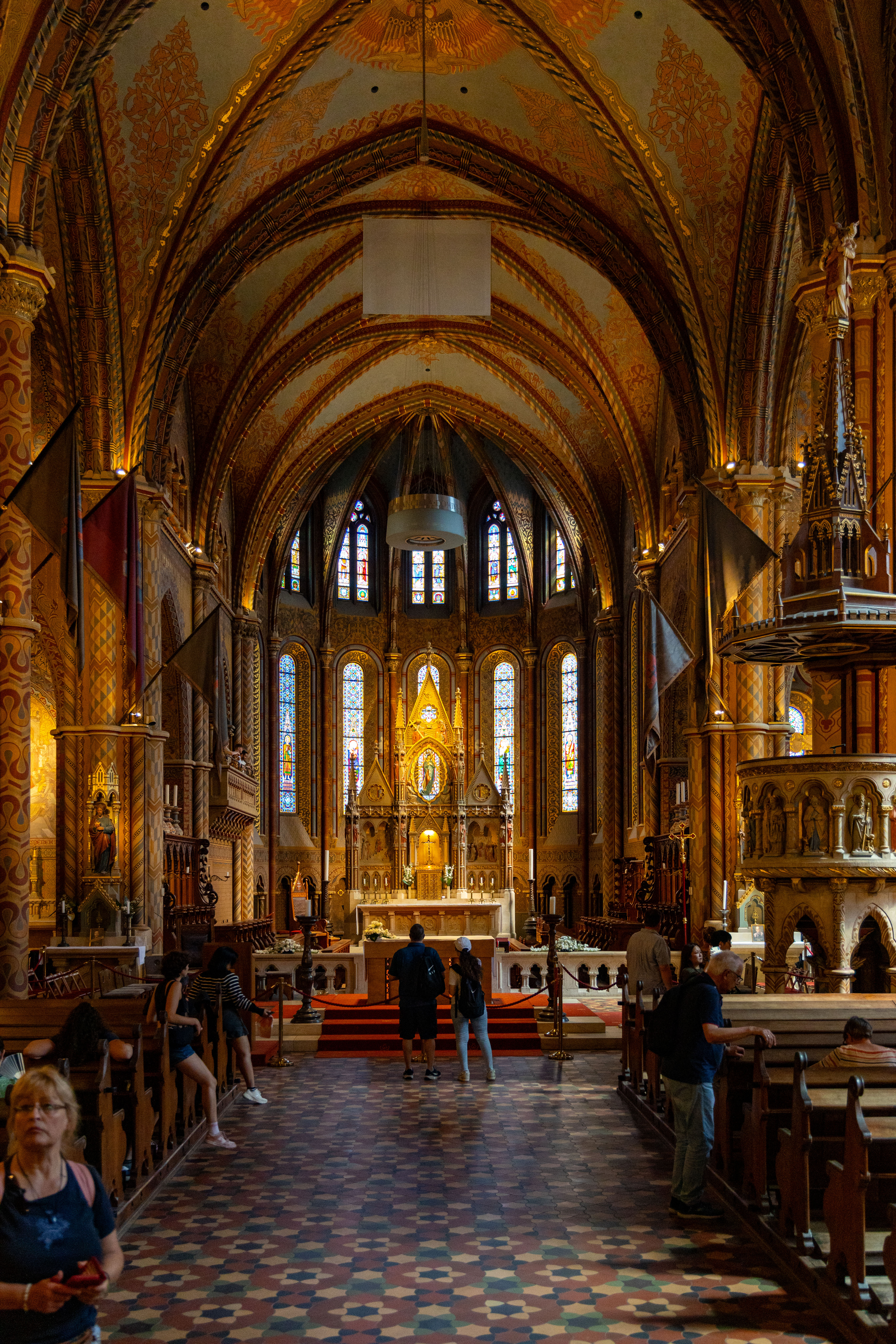 Buda Castle is the historical palace complex of the Hungarian kings in Budapest. First completed in 1265, the basis of the Baroque palace that occupies most of the site today was built between 1749 and 1769, but was severely damaged during the Siege of Budapest in World War II, and rebuilt in a simplified Baroque style during the state communist era. Defensive walls surround the entire Castle Quarter neighborhood to its north, which is well known for its medieval, Baroque, and neoclassical houses, churches, and other monuments. Since 2006, the area has been Unesco listed and the EU has poured billions into the rebuild which is ongoing today. The centrepiece of the main square is the St Matthias church whose interior is more painted walls and stained glass windows. The original church on this site was built in 1015, with the current version built in 1465.