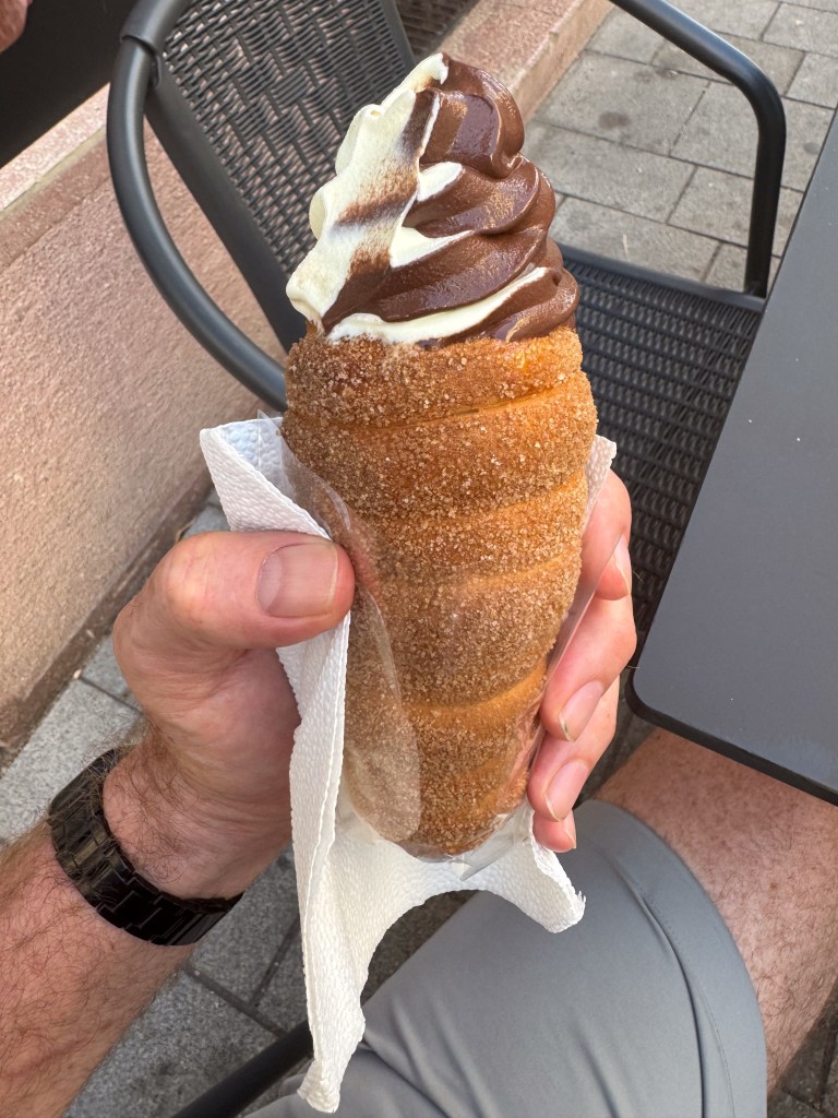 The last thing we needed to tick off in Budapest was Chimney Cake. I am now convinced that this delicacy is an invention of the You Tube tourist videos. After the gallery, we walked for a kilometre in search of a store or cafe that might sell us one. Eventually, we ended up back near the touristy riverfront before finding some. So Chimney Cake is a spiral cake normally filled with ice cream and nutella. I, of course, skipped the nutella and had chocolate sauce instead. So … box ticked!