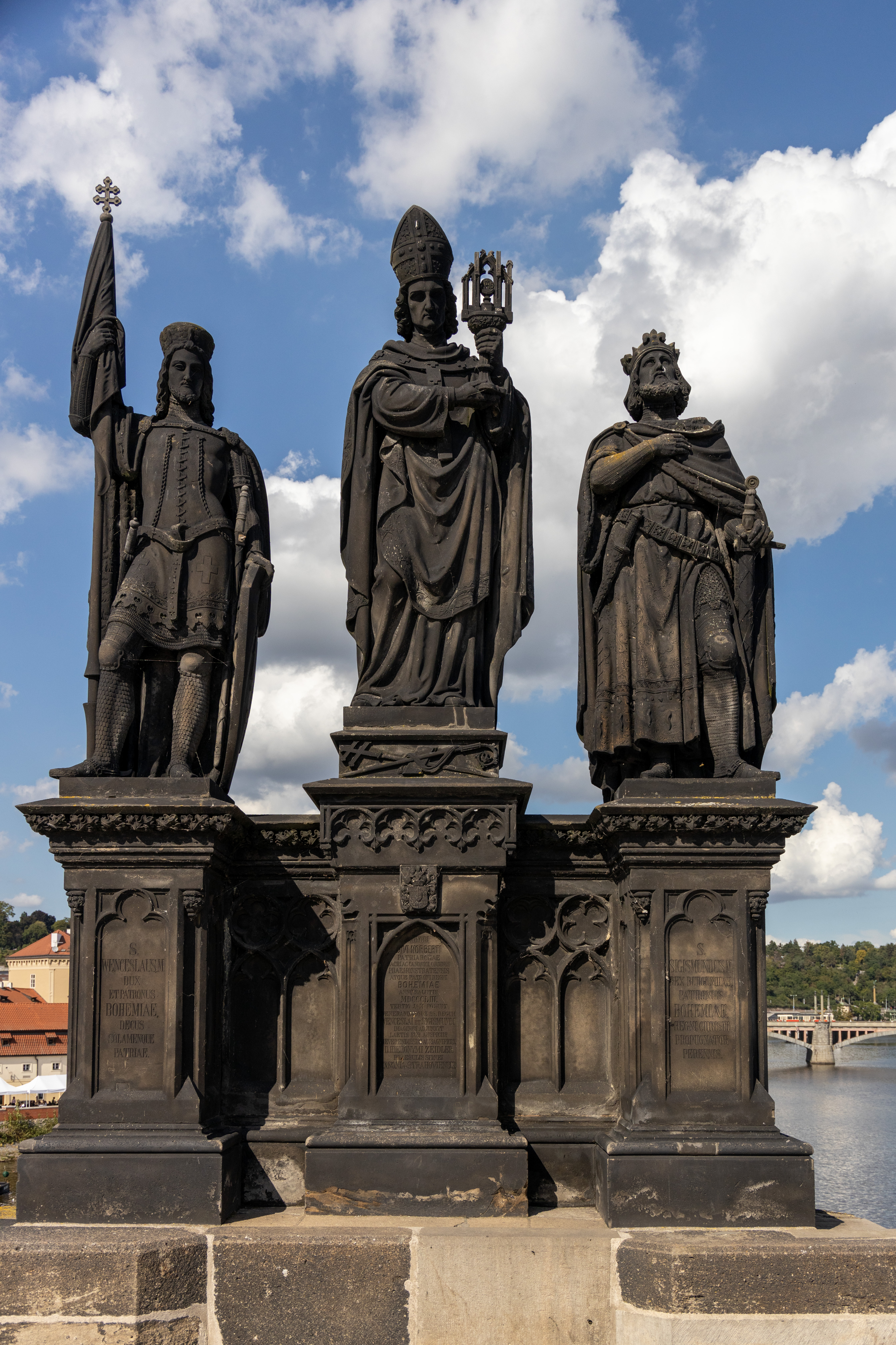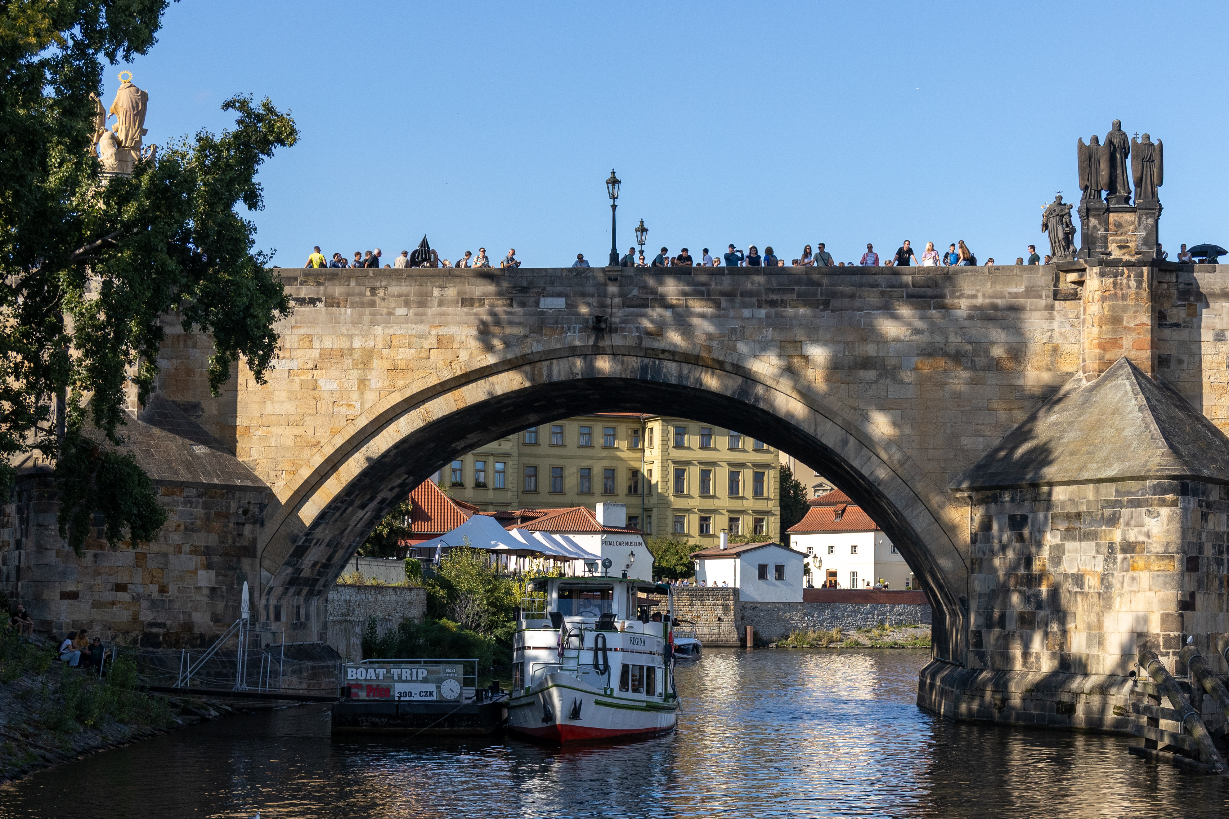 As the day wore on, the crowds grew and crossing the Charles Bridge was a bit of a people crush. Charles Bridge is a medieval stone arch bridge that crosses the Vltava river. Its construction started in 1357 and finished in the early 15th century. It was the only means of crossing the river Vltava until 1841. The bridge is decorated by a continuous alley of 30 statues, mostly in baroque-style, originally erected around 1700, but some have now been replaced and these are lighter in colour as they have not yet oxidised.