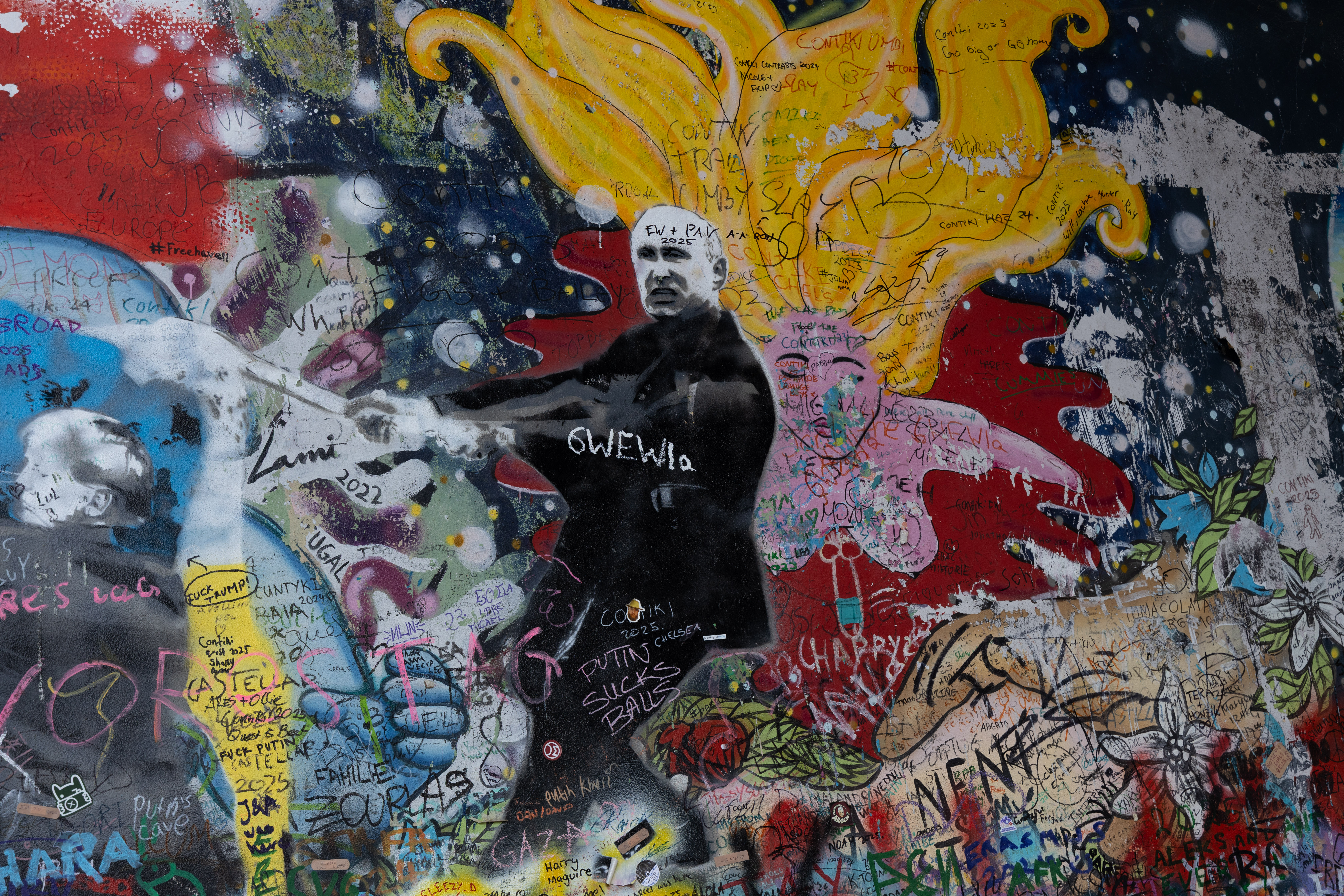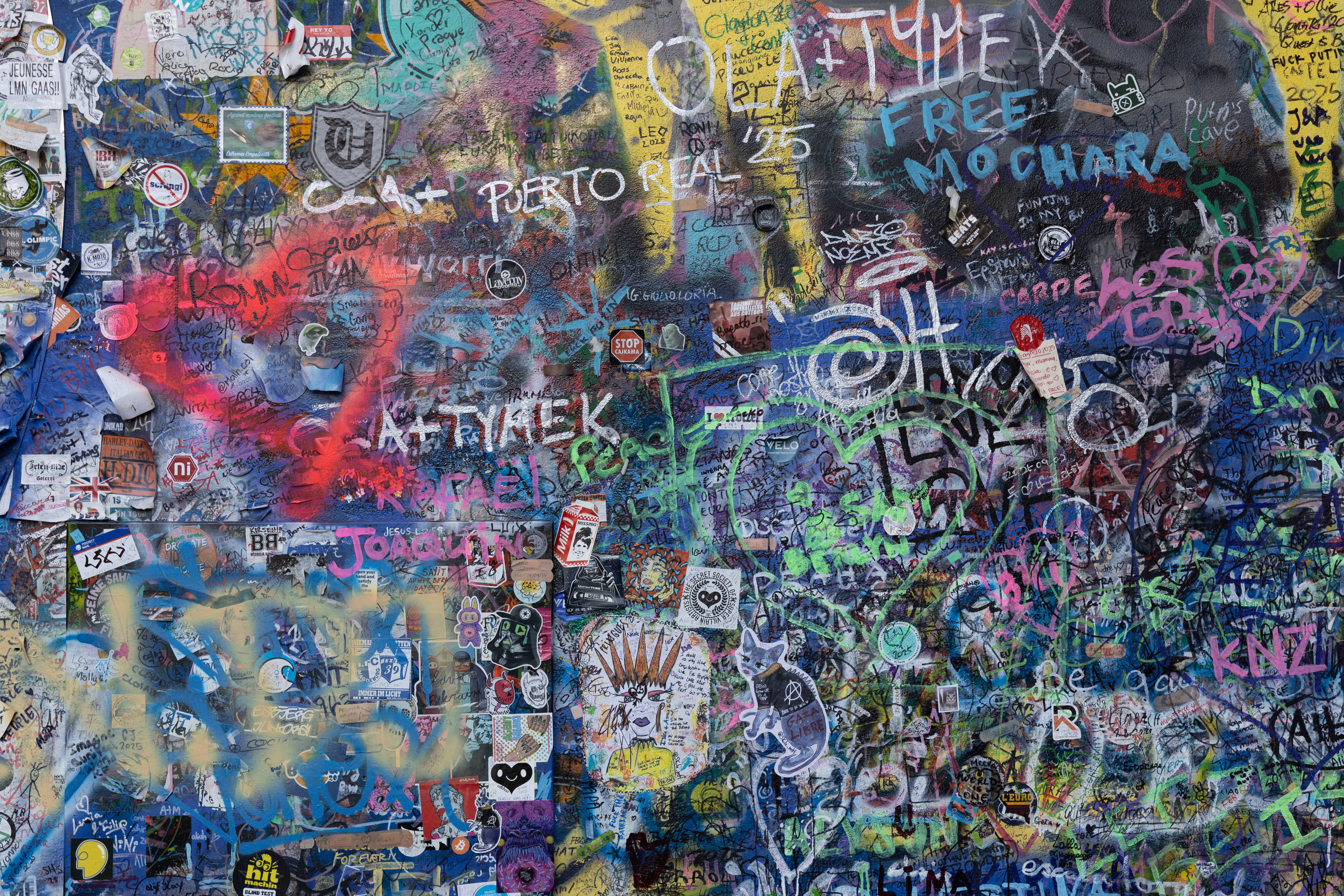 After crossing the bridge we came to the Lennon Wall, an historic legal graffiti wall. After the 1980 murder of John Lennon a mural of Lennon was painted by an unknown artist onto the wall and as more people expanded upon it, the wall slowly became a place for free expression in then communist Czechoslovakia. It has historically been used for demonstrations and carries a central theme of John Lennon, but it also features designs relating to local and global causes such as global warming. The wall has also inspired other walls across the globe, such as the Hong Kong Lennon wall.