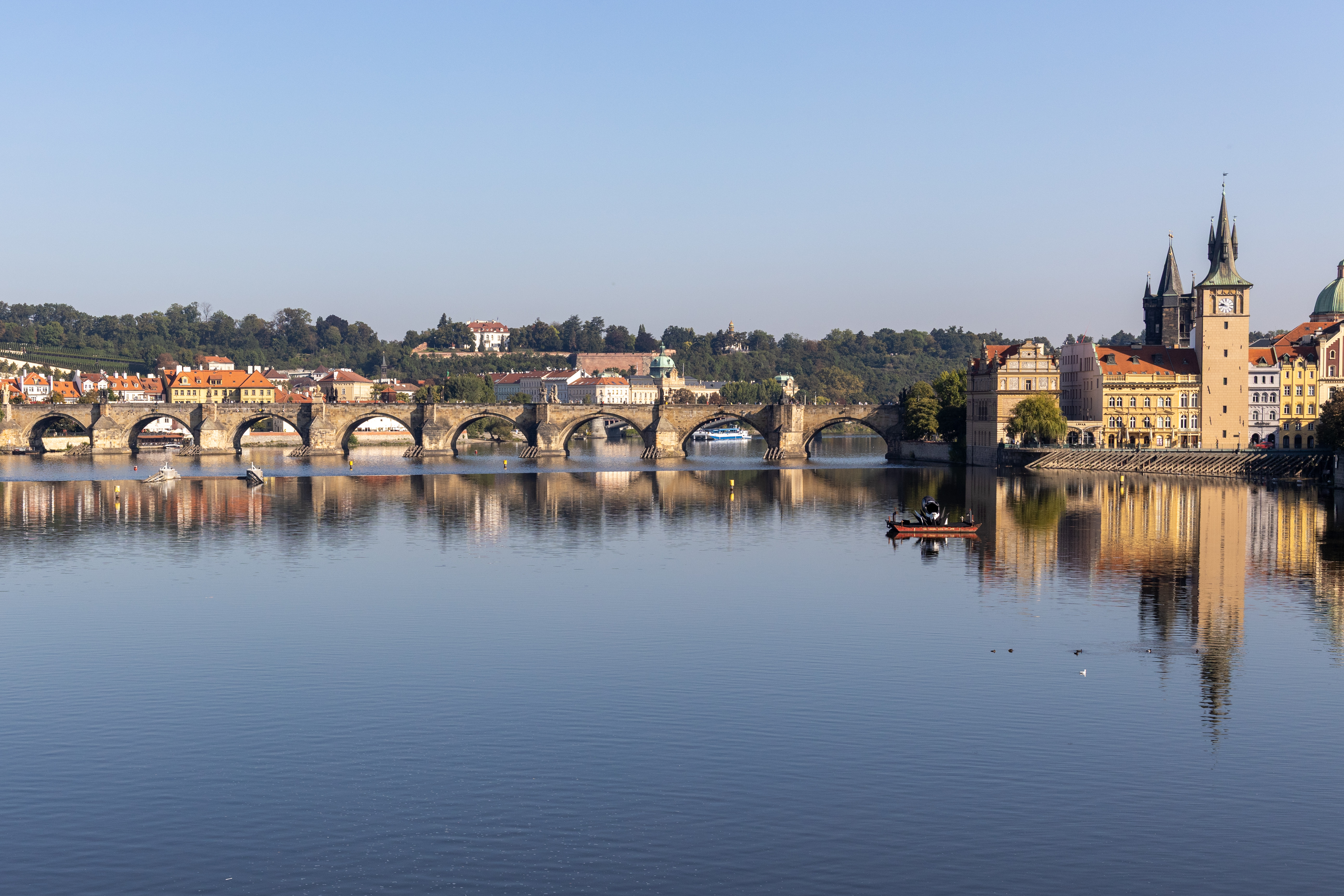 We crossed the river, pausing to take some photos in the calm morning along the river. Prague is typically a later rising town, so the photos are less impacted by people. I was particularly happy with these two snaps.